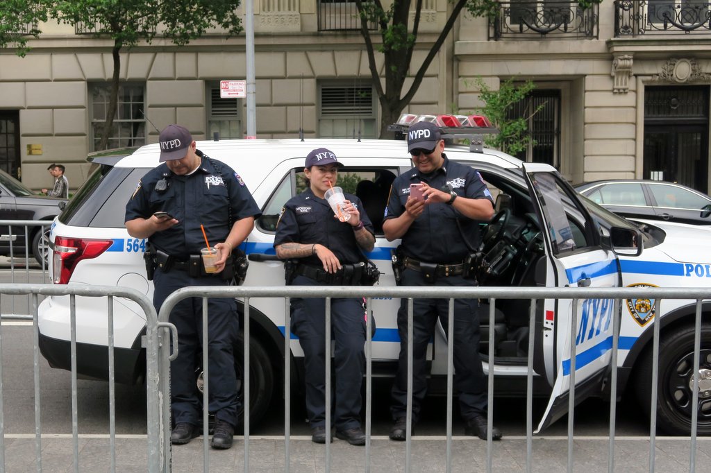 Среди полицейских много имигрантов - департамент активно набирает в свои ряды людей, говорящих на языках жителей города. Разумеется и русскоязычные среди полицейских тоже есть. А вообще они просто люди. Любят в телефон потупить, и селфи друг-другу послать.