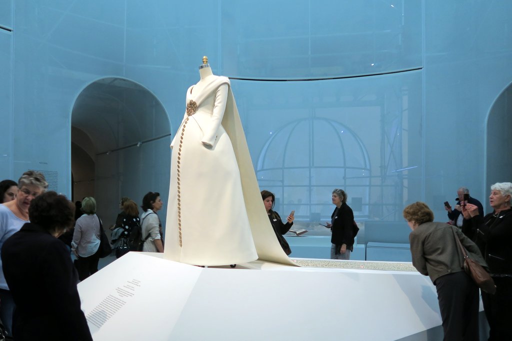 На его шлейфе с помощью компьютеров были размещены блёстки и стежки золотой нити, чтоб образовать очень замысловатый узор. Платье является главным экспонатом на выставке.