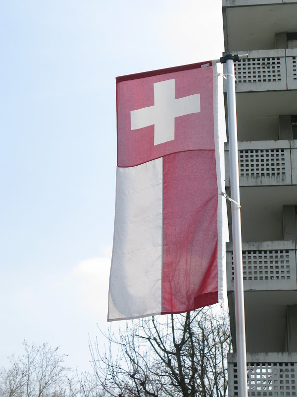 Местами висят странные флаги, видать в знак вечной Польско-Швейцарской дружбы.