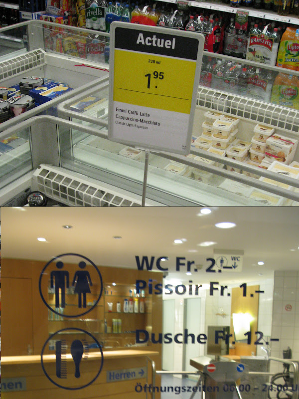 Цены в Швейцарии не только высокие, но и странные. В туалет сходить стоит дороже чем купить попить. (Правда для мужчин, по маленькому - 50% скидка.)