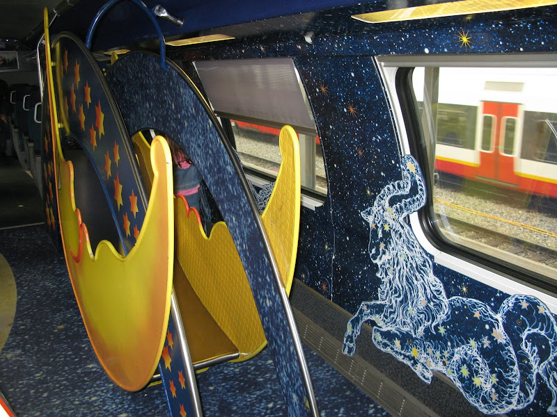 На обратном пути, на втором этаже в вагоне второго класса обнаружил детскую площадку с качелями, машинками и прочими забавами. (А мы в детстве могли только на "третей" полке плацкартного вагона играть!) Интересно чем детей в первом классе балуют?!