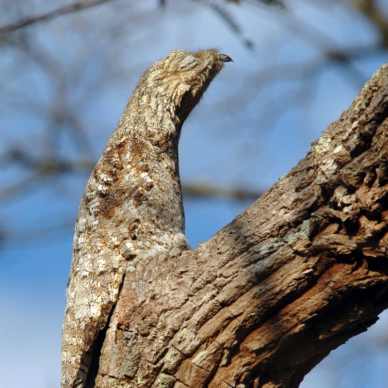 Просто он написал в своём посте только о том, как эти Козодои - мастера камуфляжа. При любой опасности, они садятся на ветку, задирают голову клювом вверх, и абсолютно не двигаются. Но самое главное, они жмурят глаза. Так их становится трудно отличить от ветки дерева! Впрочем, не буду повторять его пост, почитайте его сами.