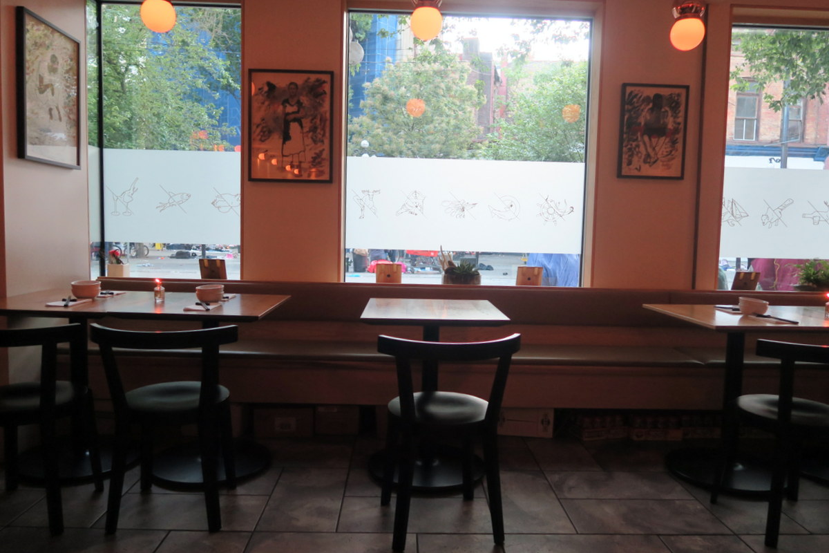 Город уже несколько лет пытается сдвинуть эту "ярмарку" куда-то ещё, чтоб наконец очистить один из своих самых центральных районов, но пока что этого сделать не удаётся. Зато прямо через дорогу от "треугольника" уже открылся хороший ресторан - думаю они неплохую скидку на аренде получили. Чтоб на портить лишний раз своим посетителям аппетит, хозяева заклеили окна (они как раз выходят на Пионеров) матовой плёнкой.