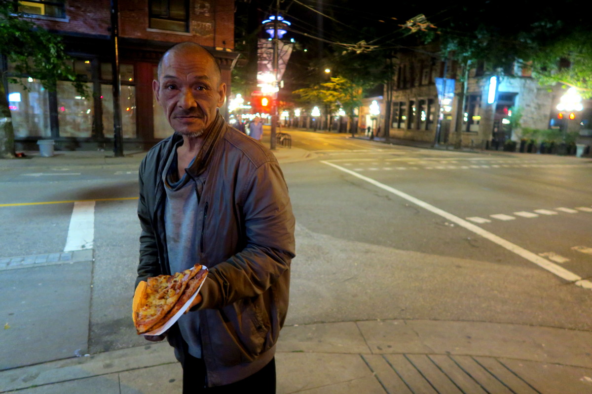 Этот молодой человек подошёл ко мне, с позавчерашним куском пиццы и предложил мне его купить за доллар. Когда я сказал, что только что поел, он спросил не хочу ли я дать ему доллар просто так.