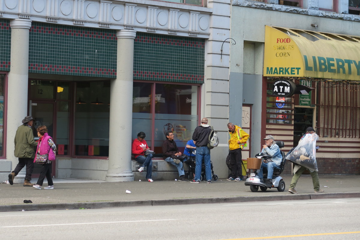 На тротуарах Бомжтауна полно людей от которых, как и от зданий веет неблагополучием. Причём если не обращать внимания, сразу так и не заметишь этого. Это в основном белые люди, одетые не то чтоб в лохмотья, но видно, что одежда не первой свежести. Многие из них ходят с рюкзаками (тоже изрядно потрёпанными). Интересно, что почти нет людей с тележками, как у нас в Нью Йорке.