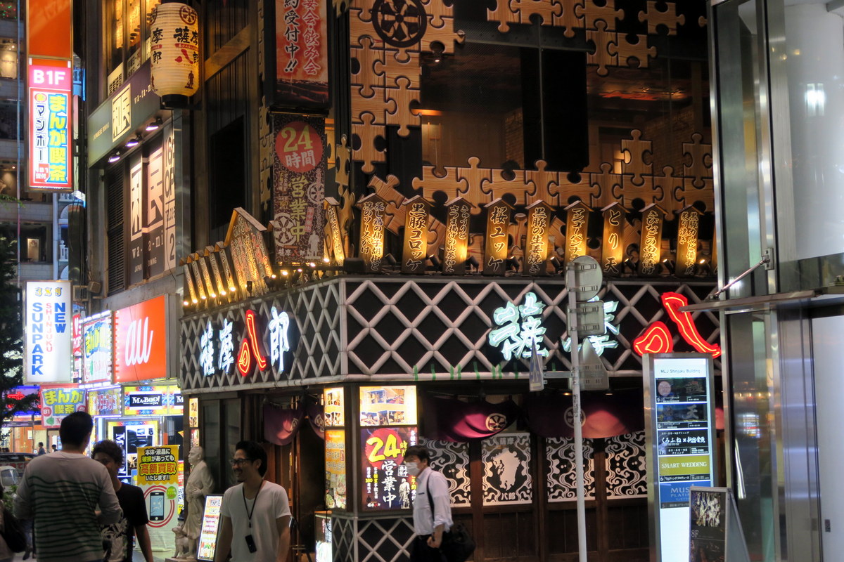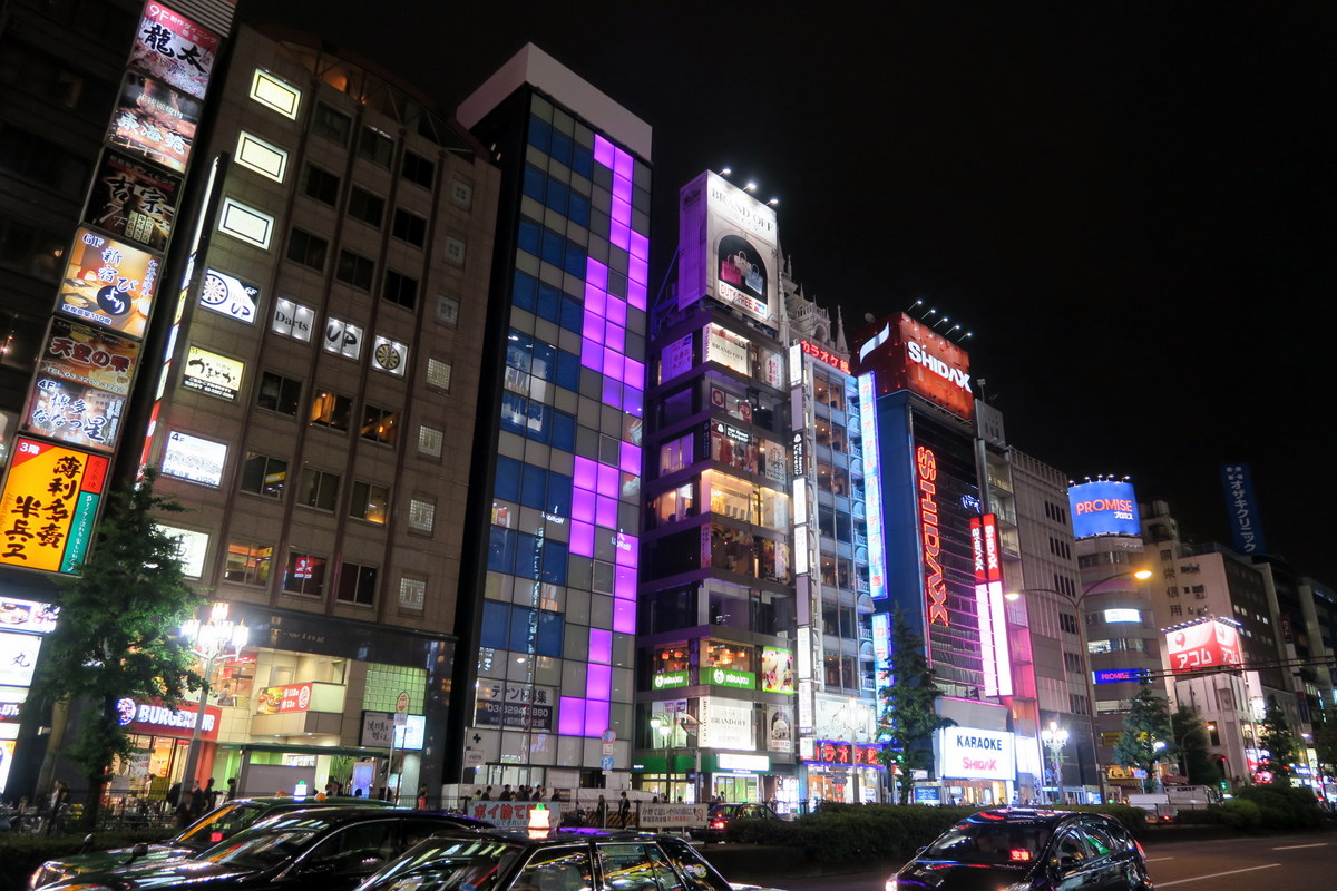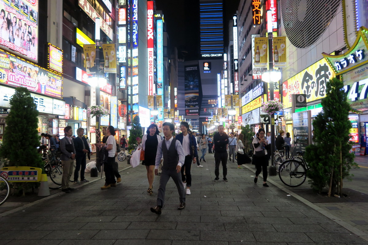 Шинджуку - один из более стабильных районов Токио в плане землятресений, поэтому здесь много высоких зданий. Ночью всё это горит и сверкает, людское внимание как будто пытаются разорвать на куски: сюда смотри! нет сюда! Например есть дом, на фасаде которого сверкают фигуры, напоминающие Тетрис.