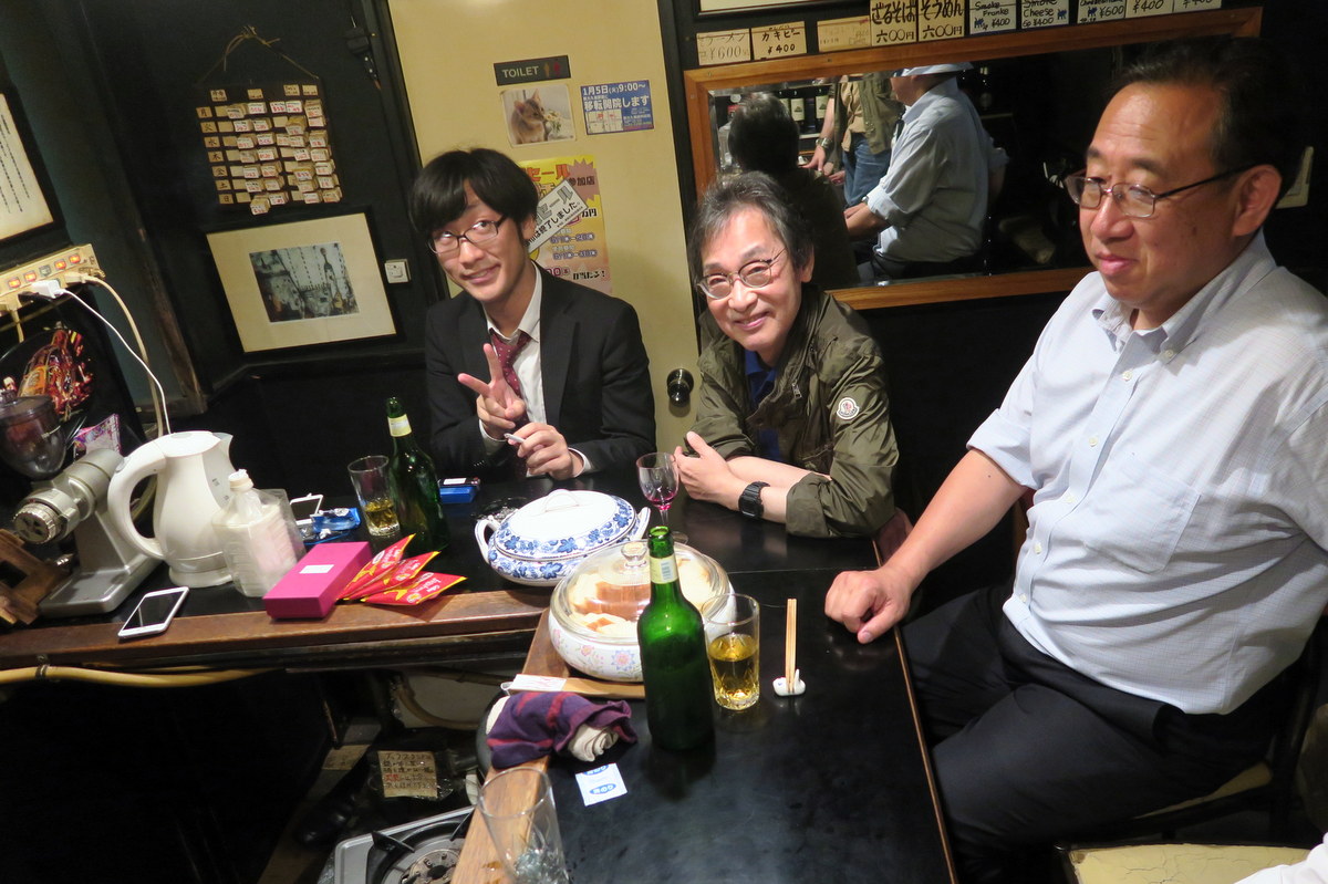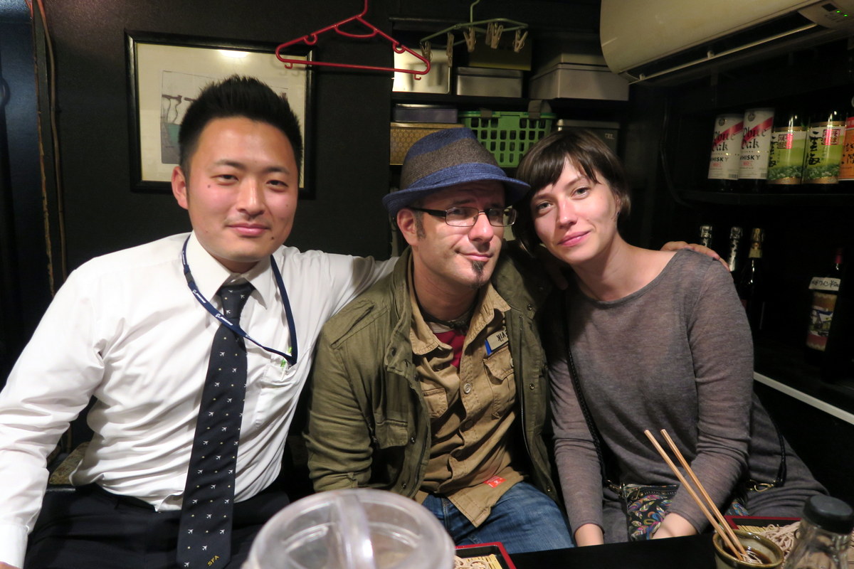 Томохиро оказался очень шустрым - за две минуты он заглянул в четыре пивнушки, перекинусля с ними парой слов, и нашёл наконец подходящее заведение. Внутри уже сидело три человека, а вместе с нами забились все шесть посадочных мест. Плюс девушка за баром - итого семь человек.