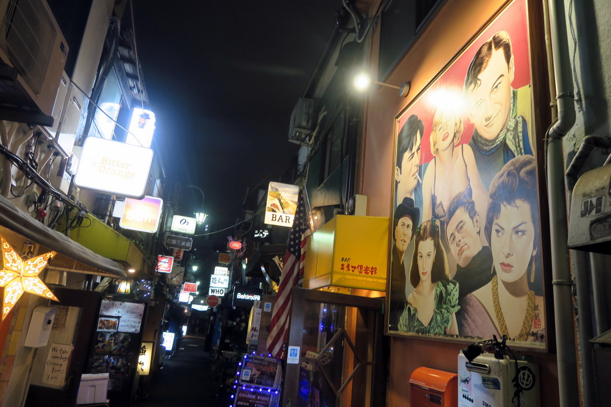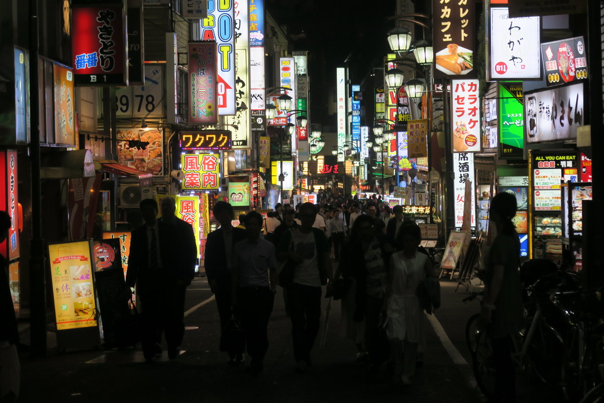 Наступал вечер, и мы решили пойти выпить за встречу, и я знал как раз нужное место. Вернее целый район этих мест. Для этого мы поехали в Шинджуку. Тут надо сказать, что по-русски правильное название района - Синдзюку, но уж больно странно это звучит. Тем более, я, будучи американцем, читаю его название на английском: