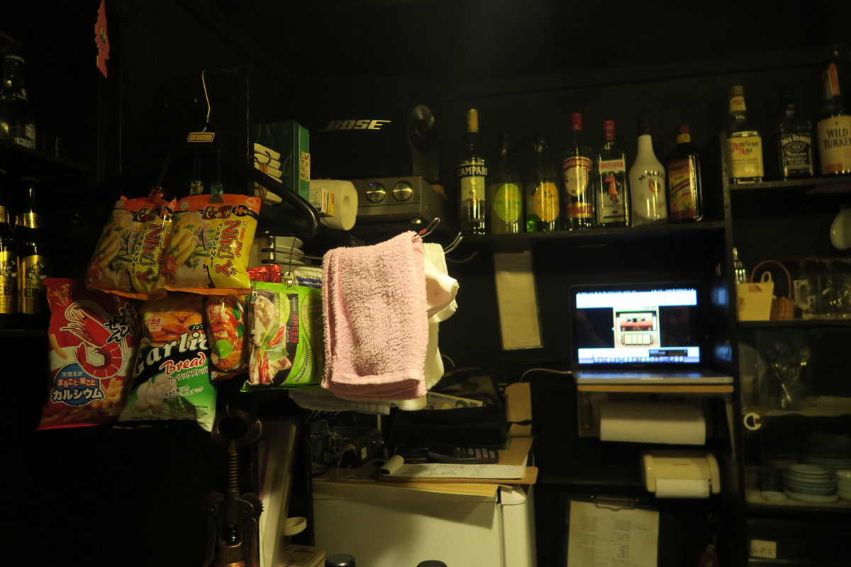 Все стены этого бара, чьё имя я так и не узнал, были завешаны полками, а полки в свою очередь тоже завешаны всякой всячиной. Если вы думали, что моя съёмная кваетирка в Шибуе была корохотной то этот бар вызвал бы у вас приступ клаустрофобии!