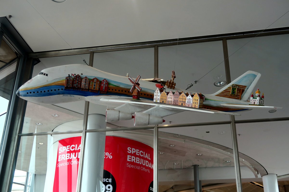 В Арланде четыре терминала, хотя один из них называют пятым (на самом деле нету первого). Весь аэропорт украшен интересными штуковинами в северо-европейском стиле. Вот например, после того, как прошли границу, увидели подвешеннй с потолка макет самолёта. На его крыльях выстроился небольшой Амстердам, а на хвосте очевидно припарковалась миниатюрная Москва.