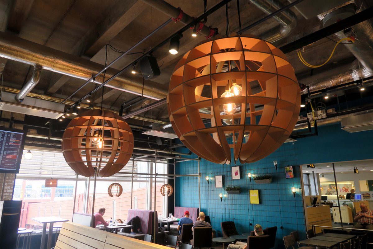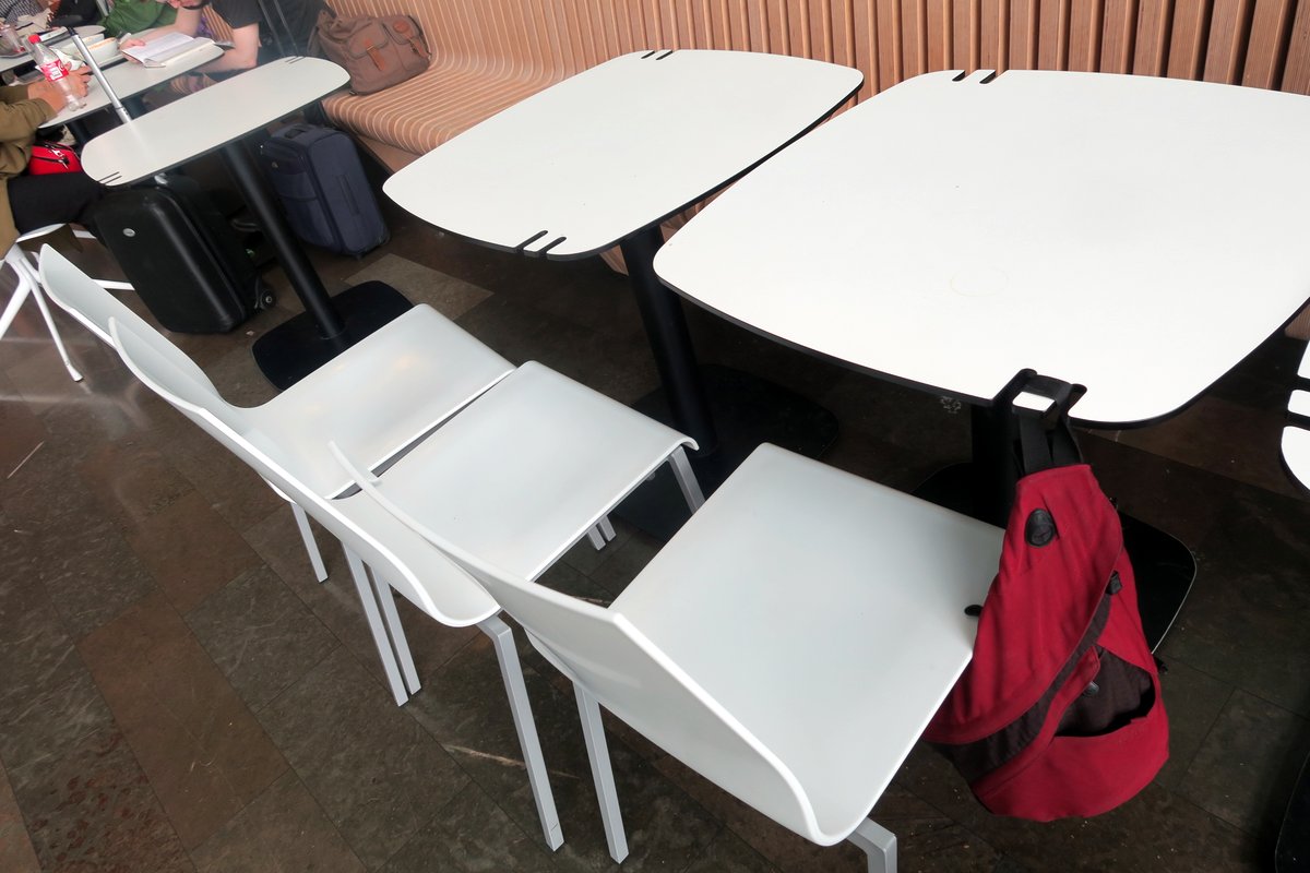 "Как будто в Икею попали," сказала Тоня, оглядывая интерьер терминала. И действительно, вся мебель здесь была простая, красивая и удобная. Полная дешёвых, но хорошо продуманных мелочей. Например, посмотрите на столики в кафе: с помощью пары надрезов они создали крючки, на котоые можно повесить сумку.