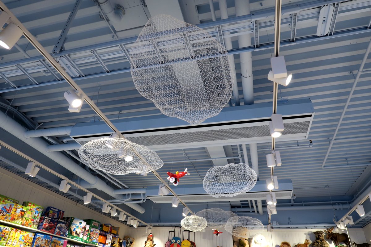 А посмотрите как красиво оформили потолок над детским магазином! Над ним парят лёгкие проволочные облака.