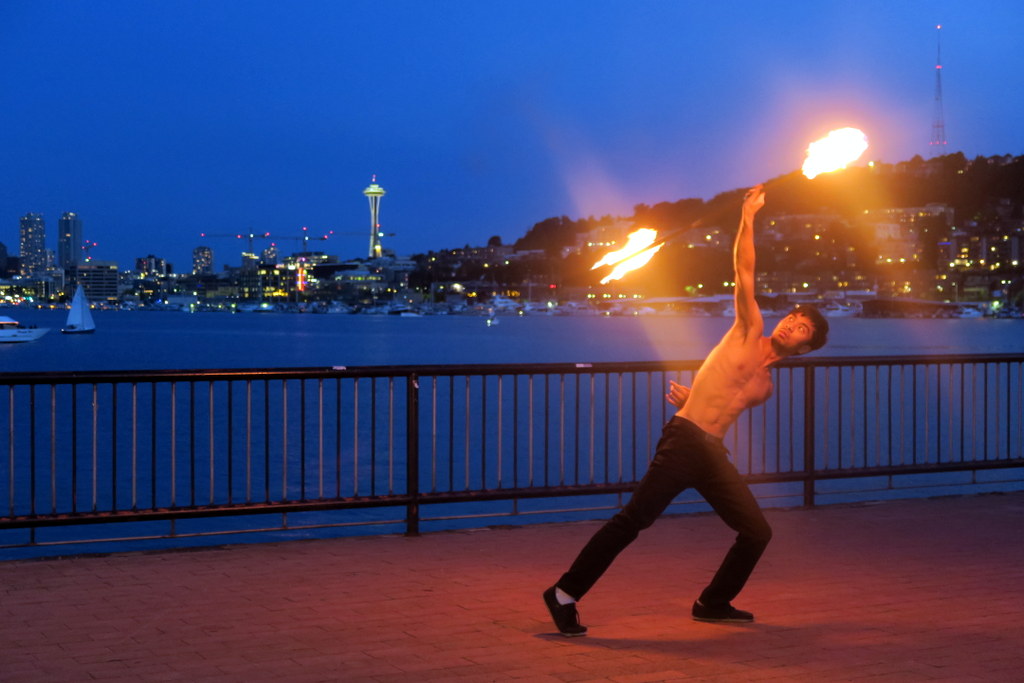 Вечерело. Мы сидели и смотрели, как зажигаются огни города. А рядом заиграла музыка. Оказалось, что на берегу у воды какие-то местные ребята начали вертеть огонь. Этот пышный молодой человек оказался на удивление ловким.