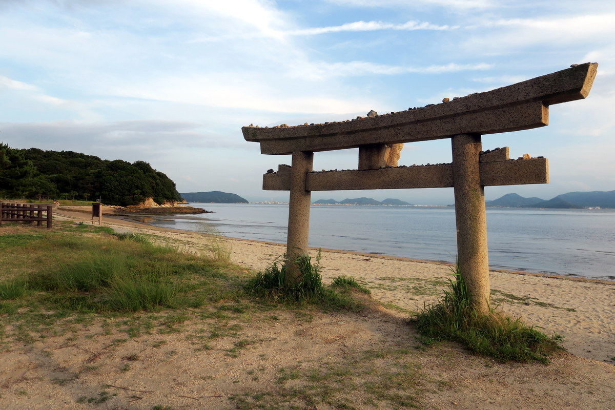 У воды стоят красивые каменные ворота-тории. Они как-то углубились в песок, из-за чего выглядят по-милому низкорослыми.