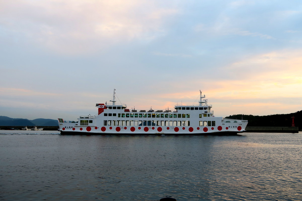 Даже паром, возящий туристов на Наосиму тоже в красный горошек.