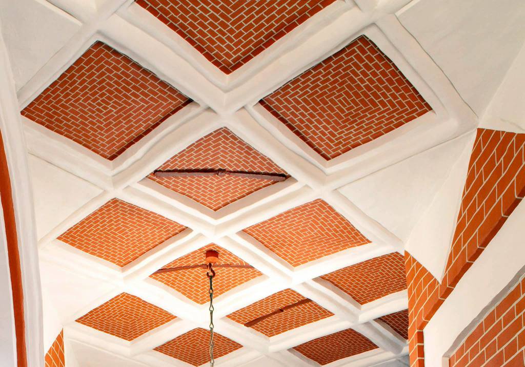 В Покровском соборе достаточно много открытой кирпичной кладки в интерьере: покрытие пола в нескольких церквах, стены внутристенной лестницы, а также бОльшая часть помещений подклета. Поскольку на стенах и сводах этих помещений не было выявлено красочных слоев, реставраторы не стали покрывать их росписями. И тут как раз очень хорошо видно, что кладка состоит из разных кирпичей, иногда даже стесанных под углом для выравнивания рядов кладки.