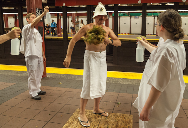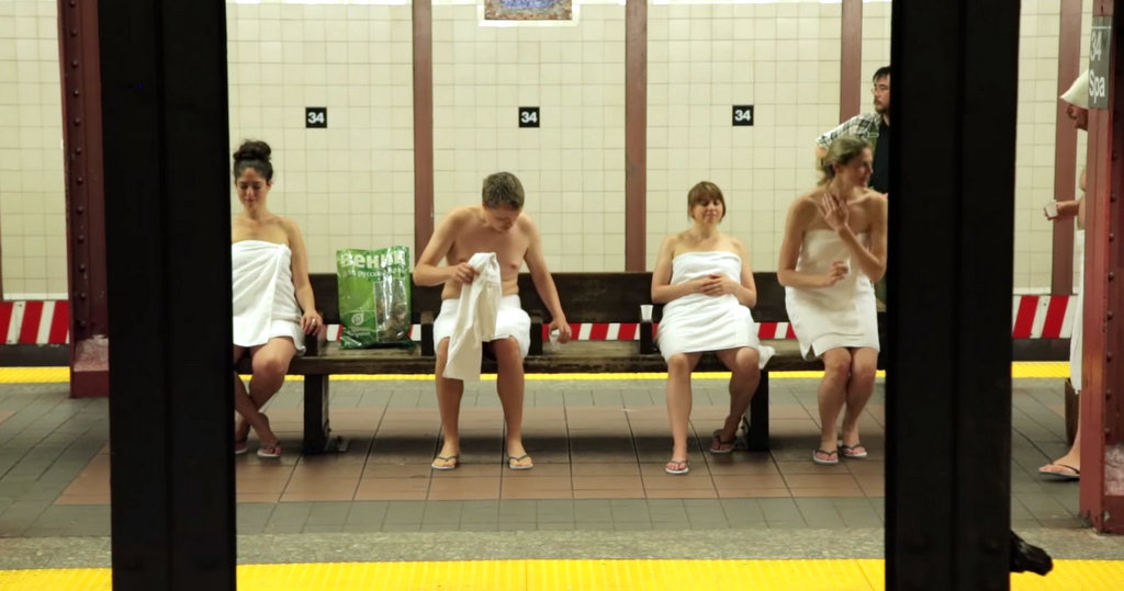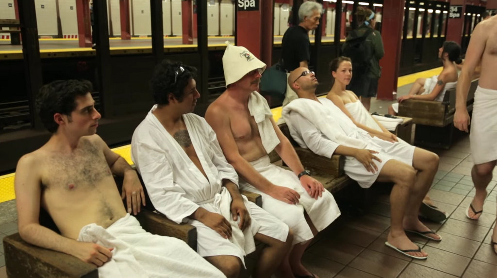 А в метро - и того хуже! Там настоящая баня. Об этом я и расскажу - как весёлые ребята обыграли тему парилки на платформе нью-йоркского метро.