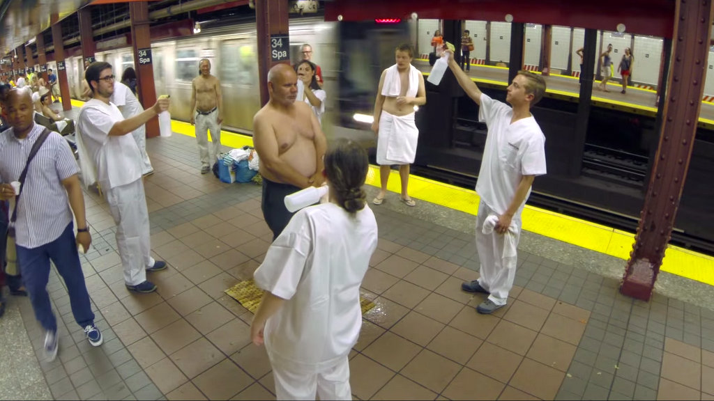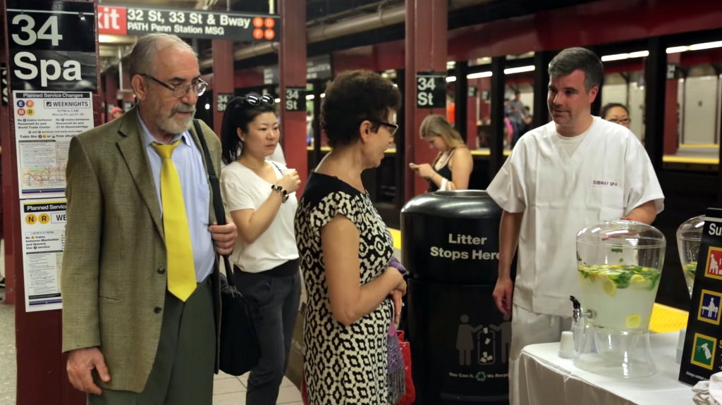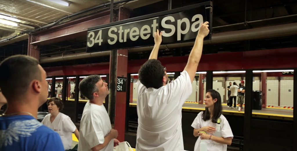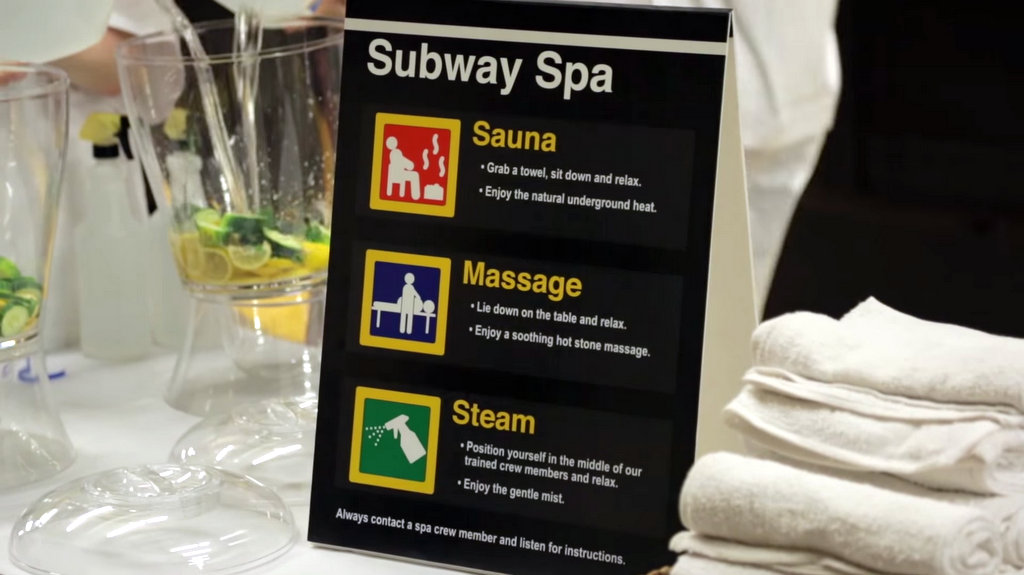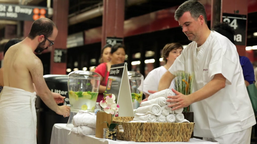 Пару лет назад нью-йоркский коллекив Improv Everywhere решил, что наше метро - самое подходящее место для спа-центра. Для этой цели они выбрали платформу станции 34 Street, где встречаются несколько линий метро. На несколько часов, станция превратилась в 34 Street Spa.