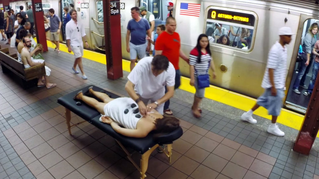 Некоторых удавалось уговорить на массаж с горячими камнями. Массажный стол группа тоже принесла с собой. Вот хороший повод прилечь в нью-йоркском метро! Не то, что...