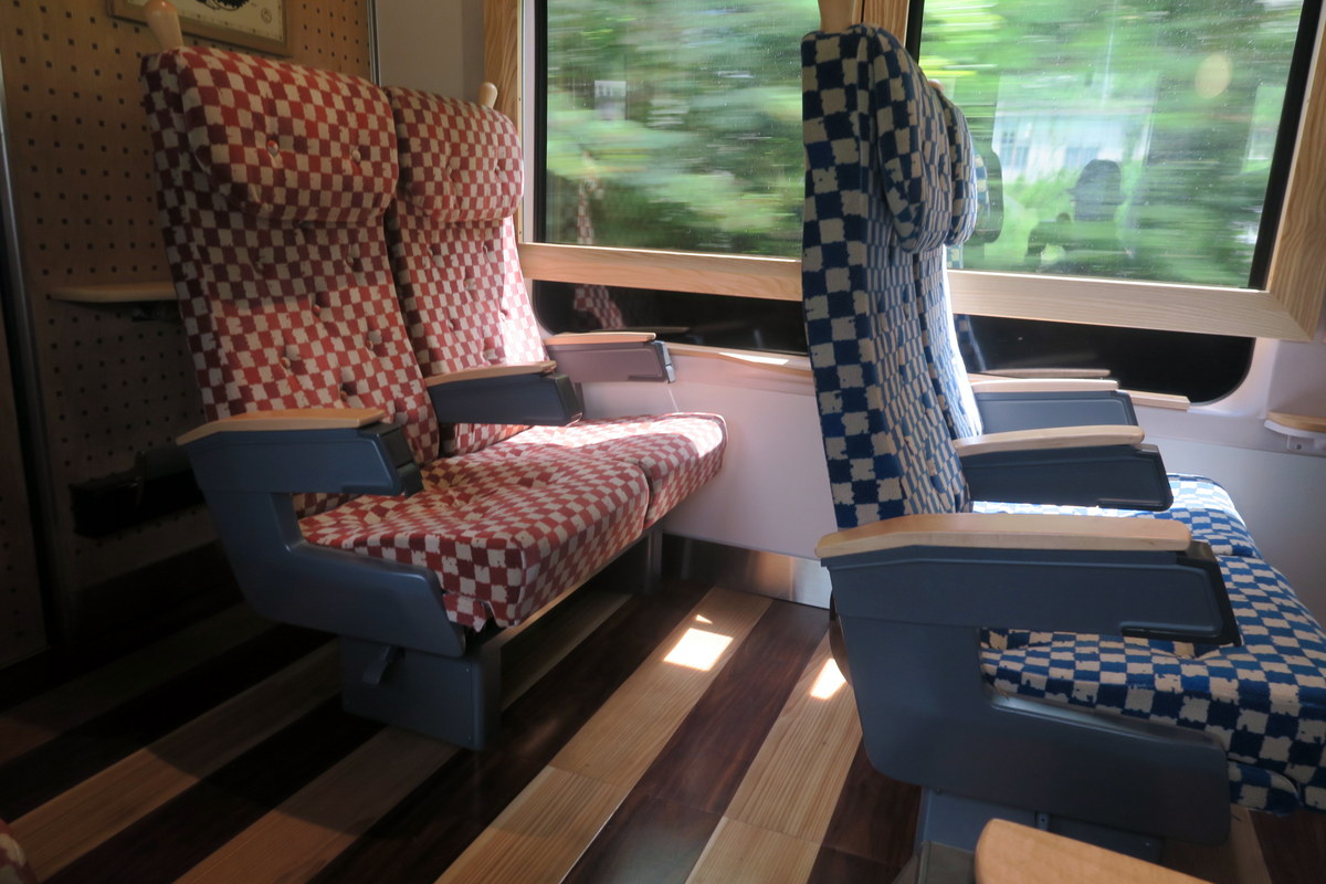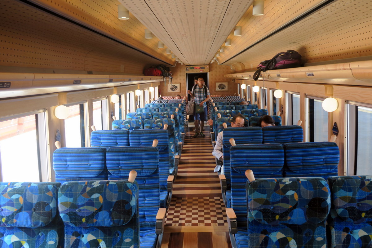 Изучив подробно два доступных вагона, мне тут же захотелось посмотреть на третий, куда мне было нельзя. К моему удивлению, проводницы разрешили мне взглянуть на него, при условии, что я не буду его фотографировать. Интерьер того вагона был уникальным, мне понравилось настолько, что я даже доплатил было сколько-то иен (кажется полторы тысячи, не помню), лишь бы прокатиться в нём. Но, потом понял, что ехать всего сорок минут. Вот бы на таком по всей стране!