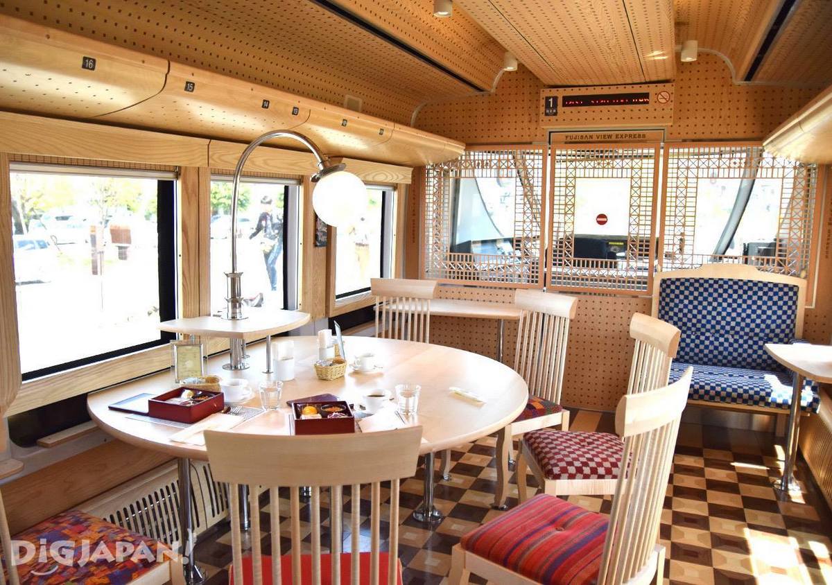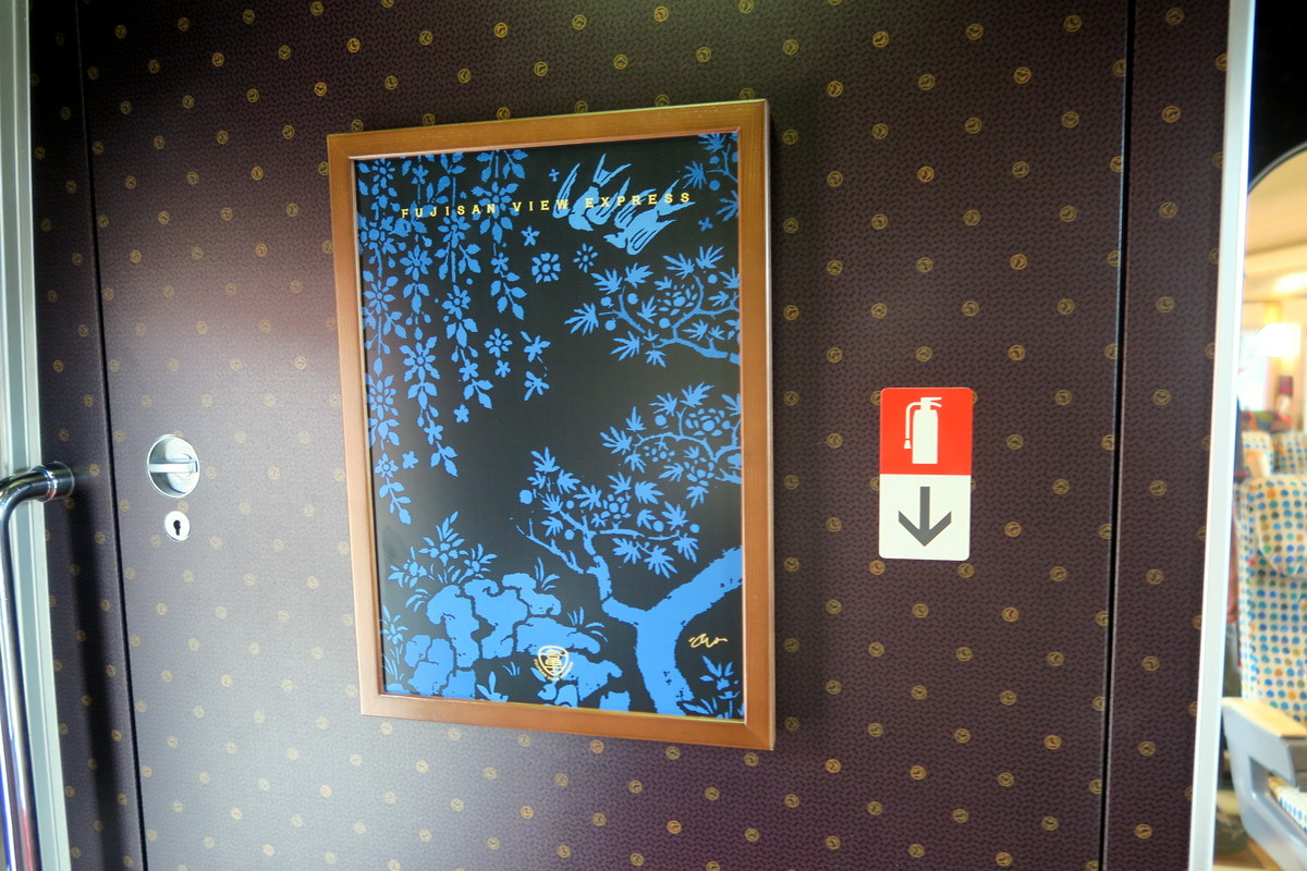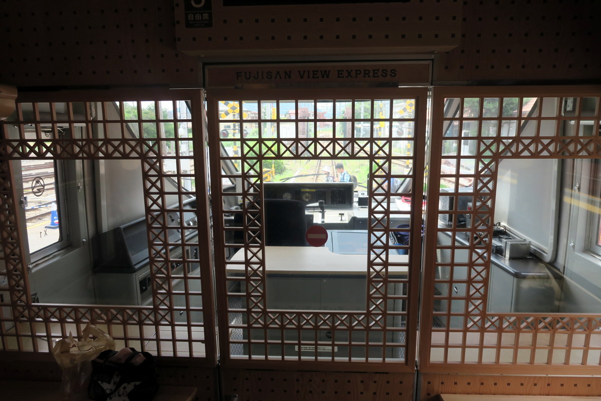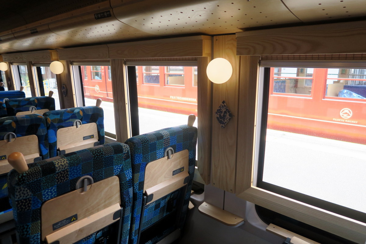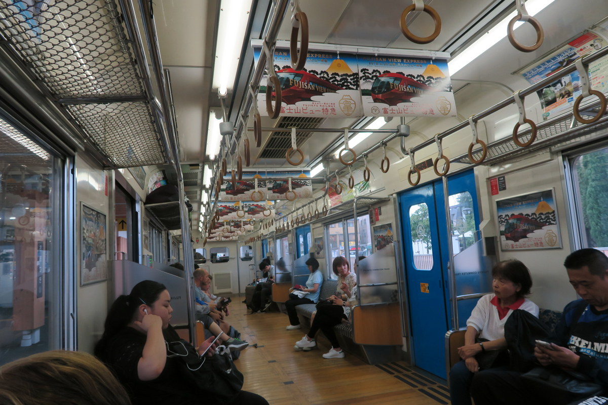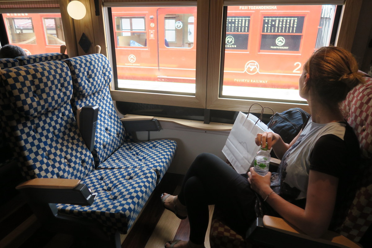 Я сразу решил, что на пути назад хочу проехаться на таком поезде! Благо расписание позволяло - они ходят по тому же маршруту, что и обычные поезда к Фудзи. Красивенький состав всего один, и он успевает проделать маршрут дважды по будням, или трижды по выходным. Стоит проезд в таком всего на пару сотен иен дороже обычного.