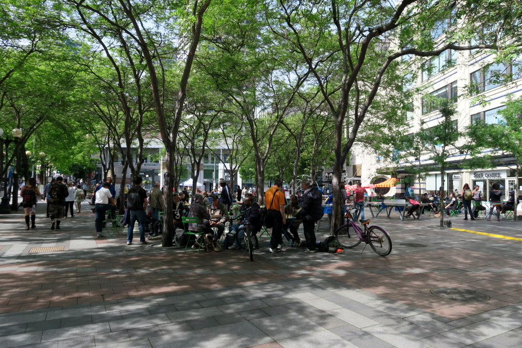 В районе даунтауна есть несколько приятных зелёных площадей, где хорошее благоустройство - лавочки, столики, даже шахматы и настольный теннис есть!