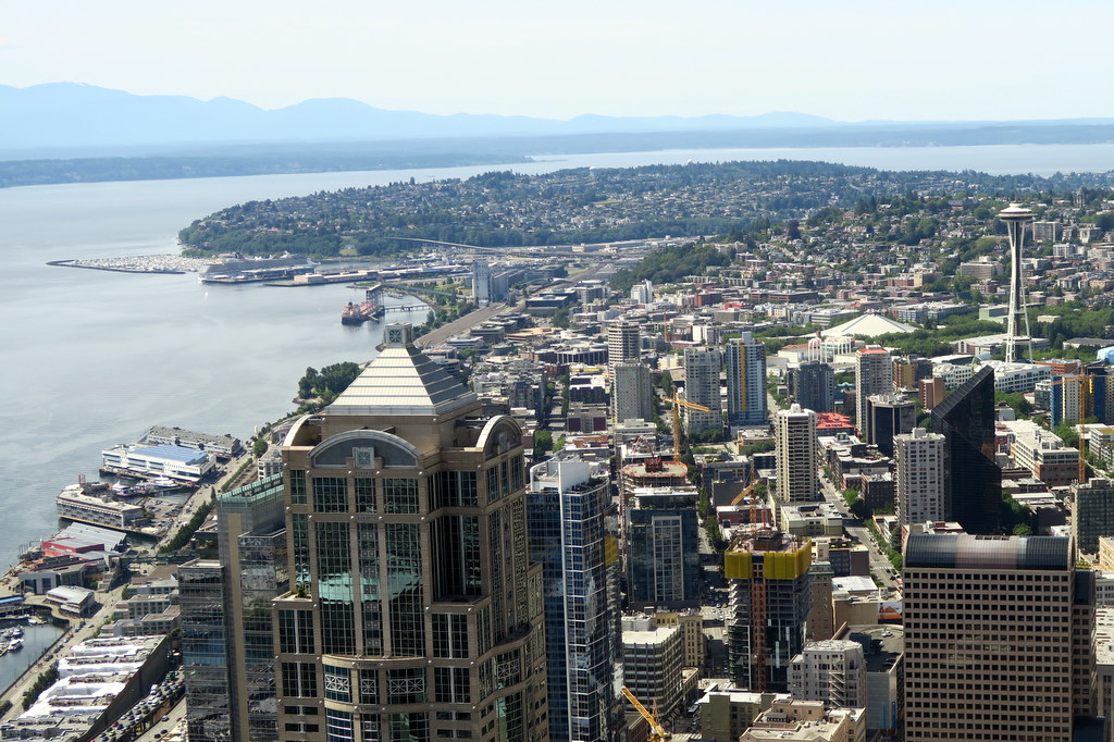 Кроме башни Спейс-Нидл в Сиэтле есть ещё одна смотровая площадка, наверху небоскрёба Columbia Center. Он намного менее известный, потому что стоит в даунтауне, и немного теряется среди остальных высоких зданий. Тем не менее он значительно выше своей башни-соперницы, его высота почти 290 мертов. Более того, после завершения в 1985 году это было самое высокое здание в запандом США (сейчас на втором месте). Вход на его смотровую стоит дешевле, чем Спейс-Нидл - всего $12.50.