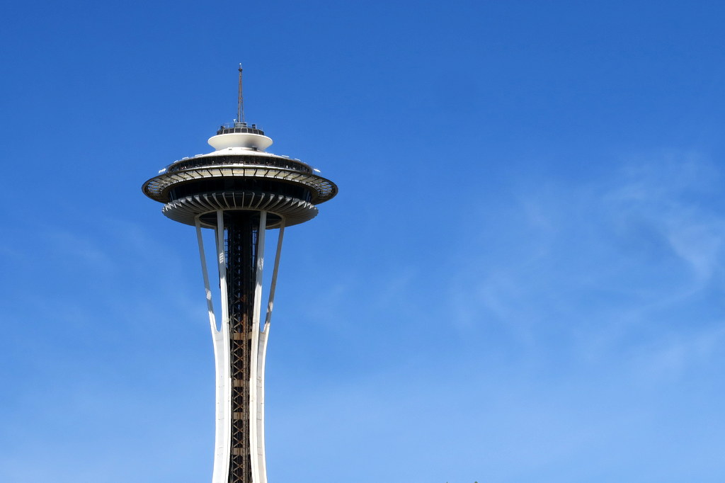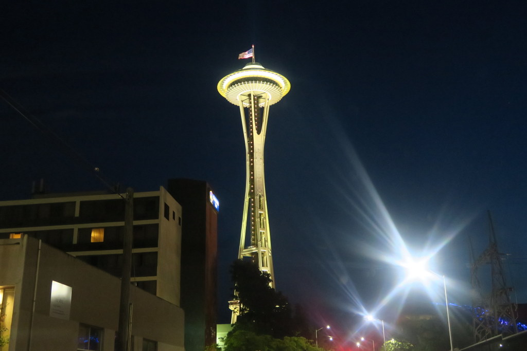 Главная достопримечательность Сиэтла - башня Спейс-Нидл (в переводе - Космическая Игла, что звучит по-русски гораздо более зловеще чем оригинал.) 184-метровая башня была построена в 1961 году, перед Всемирной Выставкой, которая прошла в Сиэтле. Она выглядит как летающая тарелка на палочке.