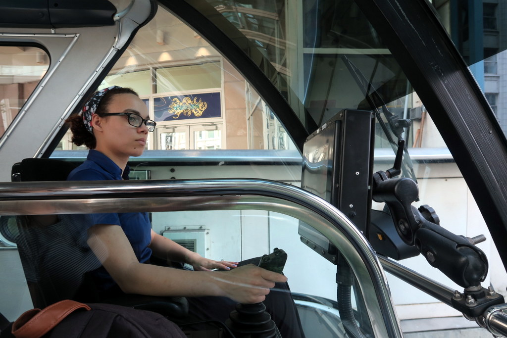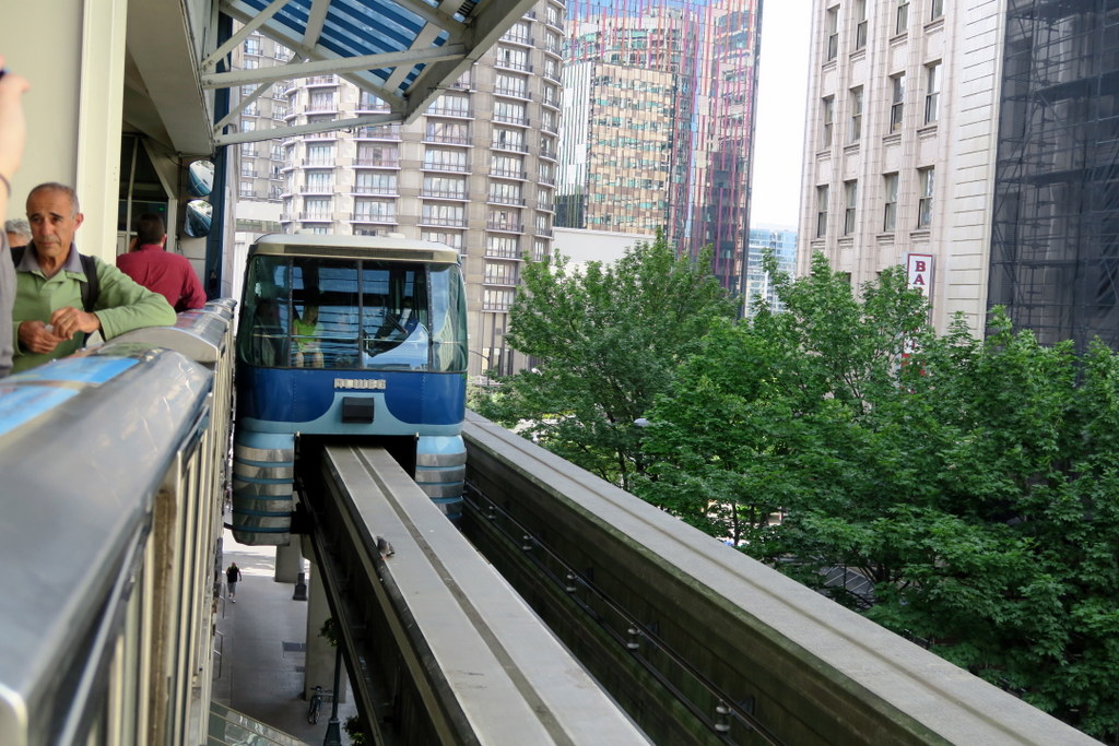 Как общественный транспорт по Сиэтлу монорельс абсолютно бесполезен - в нём всего две остановки, обе конечные. Общая дистанция - меньше двух километров. "Состав" из двух вагончиков бегает взад вперёд раз в пятнадцать минут (сама поездка занимает около четырёх). Есть ещё один состав - он ходит по отдельной рельсине, но его пускают только по особым праздникам. В остальное время он стоит на одной из остановок. Так как технология старая, то поездом управляет машинистка - автоматики тут нет.