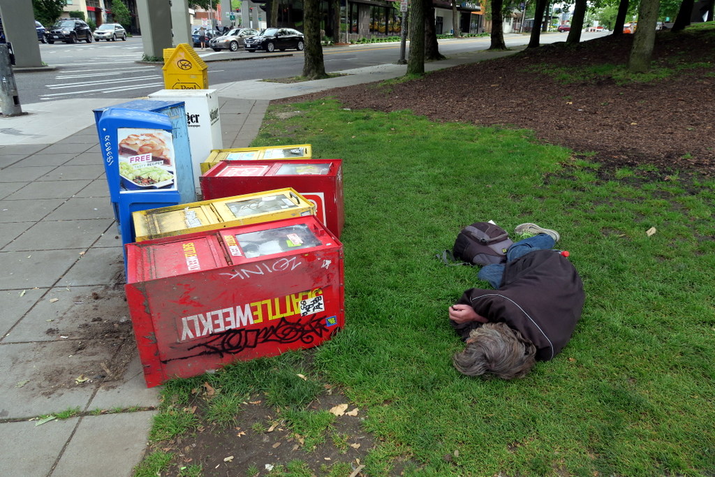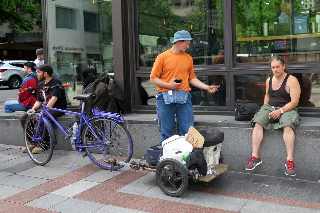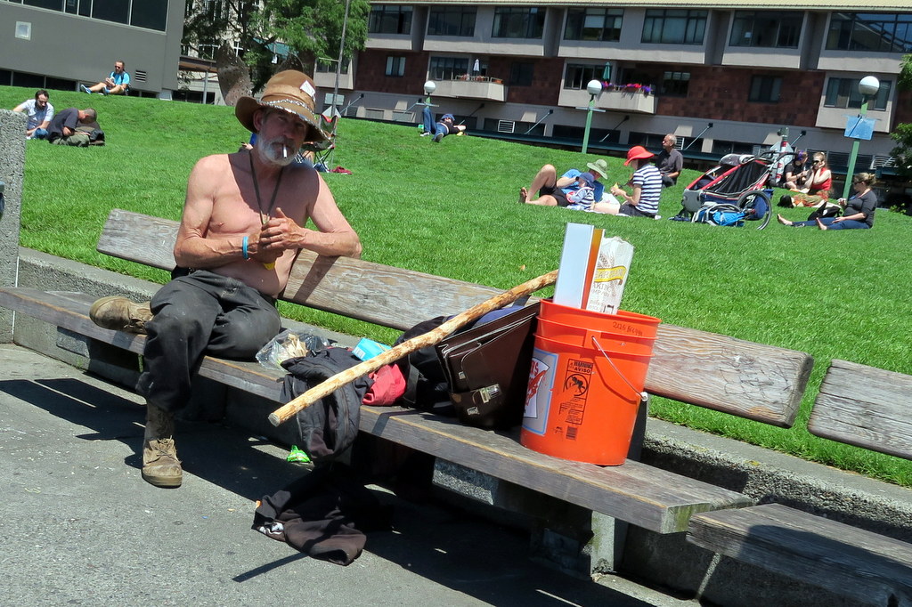 В Сиэтле полно бомжей. Они попадаются на улицах и площадях, в парках, в приличных и не очень районах. Нет какого-то одного массового скопления, как Бомжтаун в соседнем Ванкувере, но всё же их заметно много.
