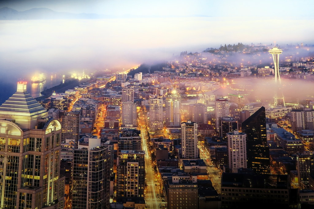 Наверху висят фотографии показывающие вид на вечерний Сиэтл.