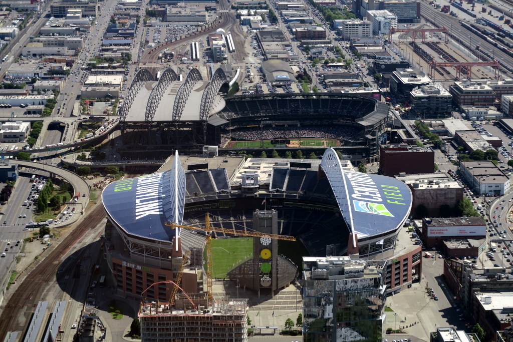 На юге от даунтауна видны крупные стадионы.