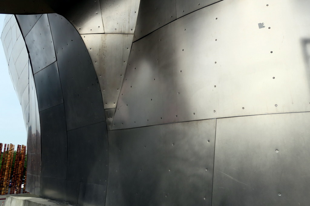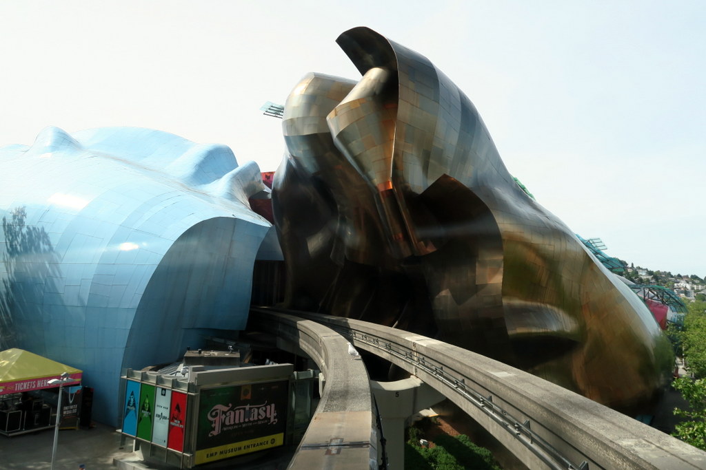 Автор этото здания - Фрэнк Гери, автор похожего музея современного искуства Гуггенхайма в испанском Бильбао. Правда если приглядеться, то металлическая облицовка EMP нахосится в гораздо лучшей форме, чем у его испанского брата. Впрочем музей в Сиетле на 7 лет моложе, его открыли в 2004, так что может и он ещё успеет покрыться ржавыми подтёками.