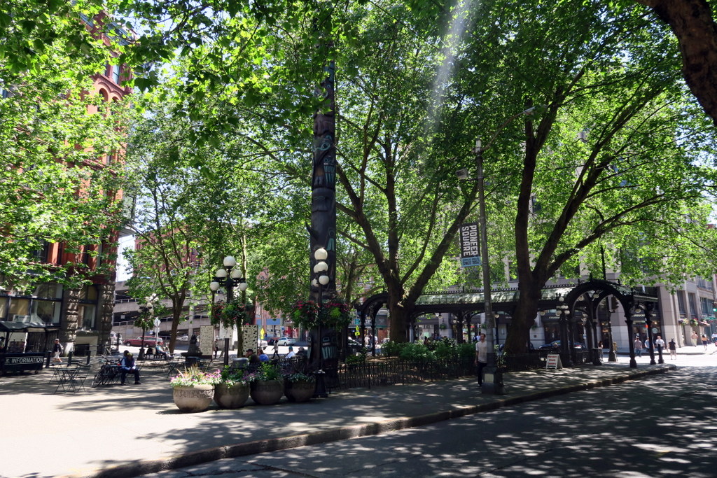 Стоят примеры туземного искусства. Это кстати Площадь Пионеров - именно здесь начался Сиэтл.