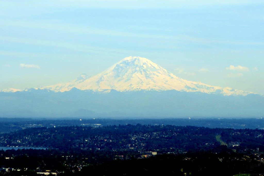 Самая главная гора возле Сиэтла - вулкан Рейнир. Его высота почти 4400 метров, и в ясные дни он чётко виден из даунтауна.
