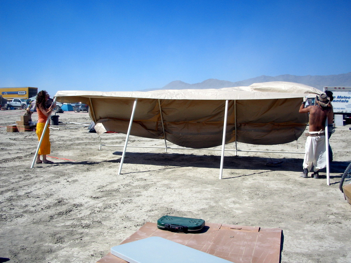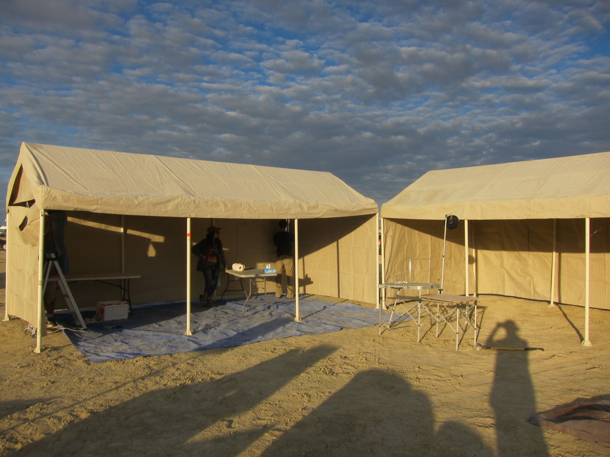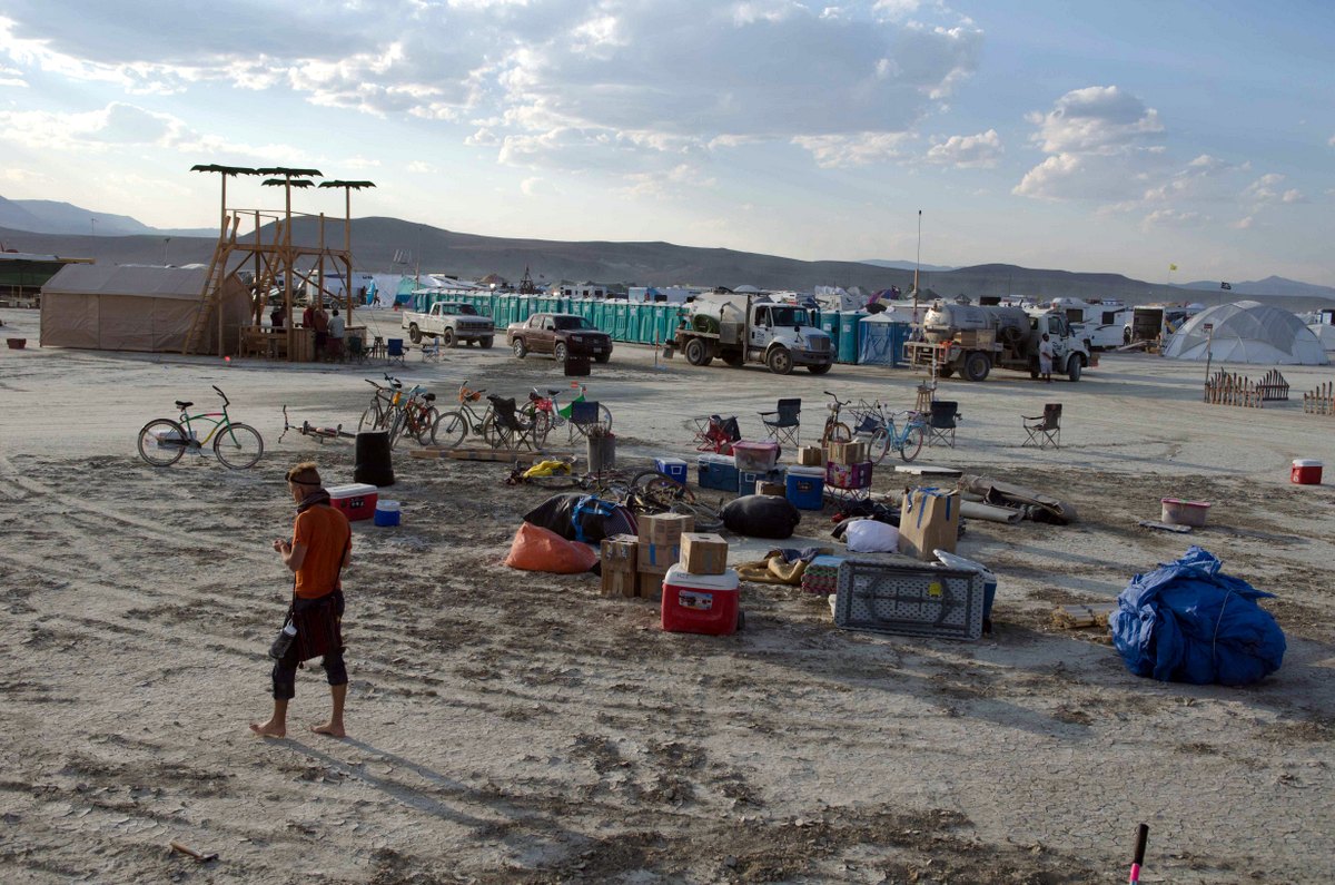 Жизнь в Black Rock City налаживается постепенно - большинство "жителей" ещё не приехали, тут пока только ранние команды. Те, что строят амбициозные проекты уже месяц как живут в пустыне, остальные приехали накануне, или сегодня, чтоб ставить лагеря.