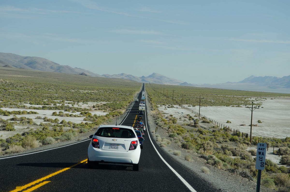 Завтракаем, делаем последние закупки, и выезжаем. Между нами и фестивалем где-то 150 миль. Дорога здесь небольшая, одна полоса в каждый конец. Весь год на ней наверное можно часами ни одной машины не встретить, но сейчас её звёздный час. По шоссе вереницей тянутся груженные машины с бёрнерами.