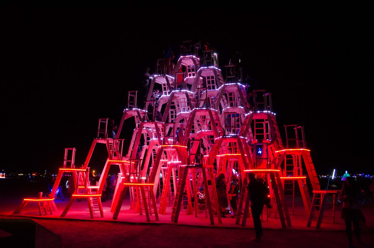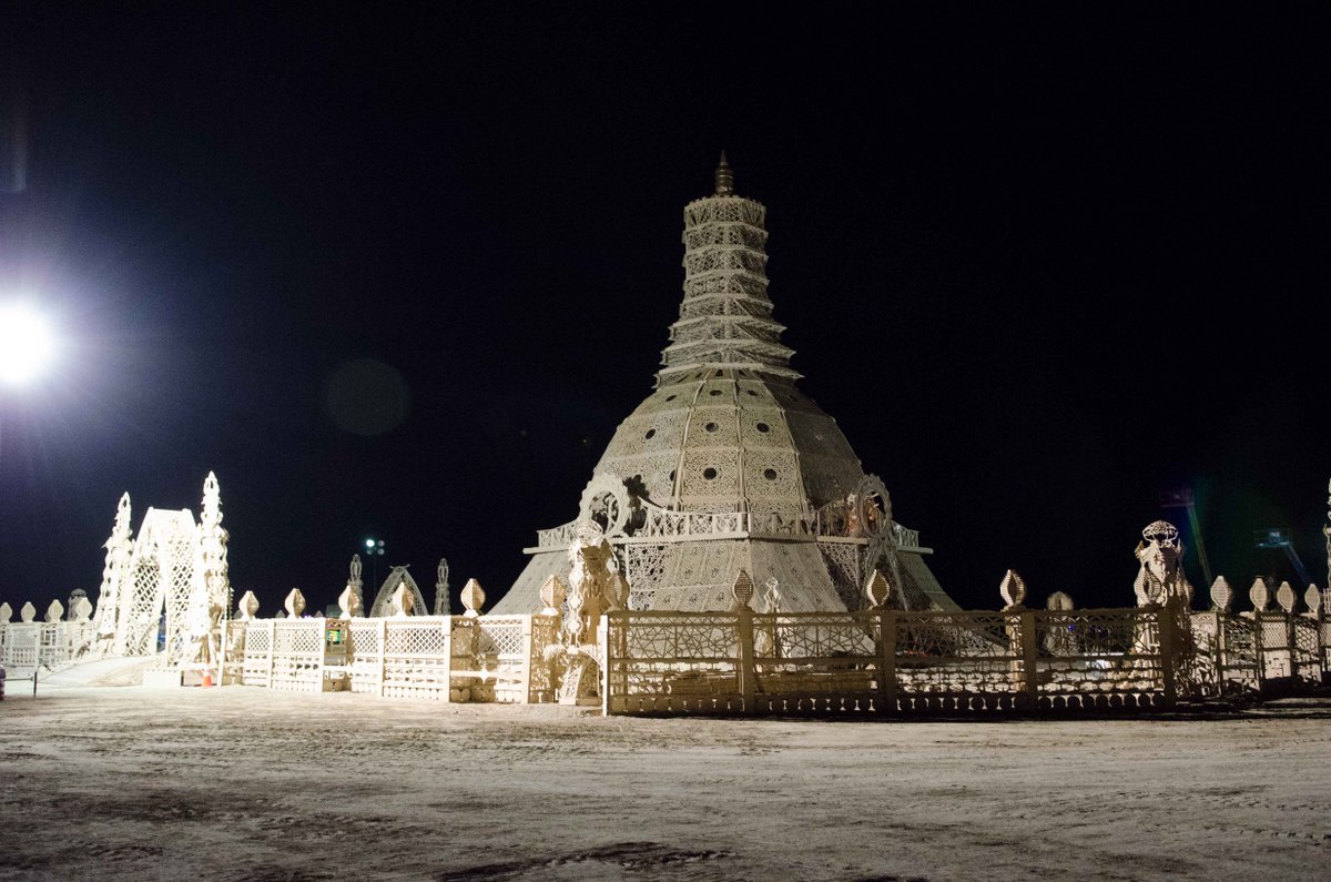 Ещё можно дойти до храма. Храм - одна из самых важных структур фестиваля, его строят каждый год заново, а в самом конце сжигают. Иногда в нашу самую первую ночь он ещё не готов - комманды работают круглосуточно при освещении ярких прожекторов. Каждый храм - произвидение искусства!
