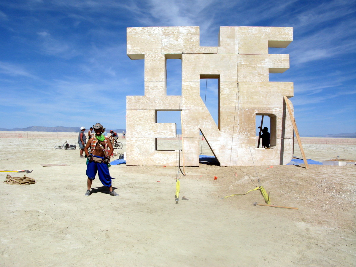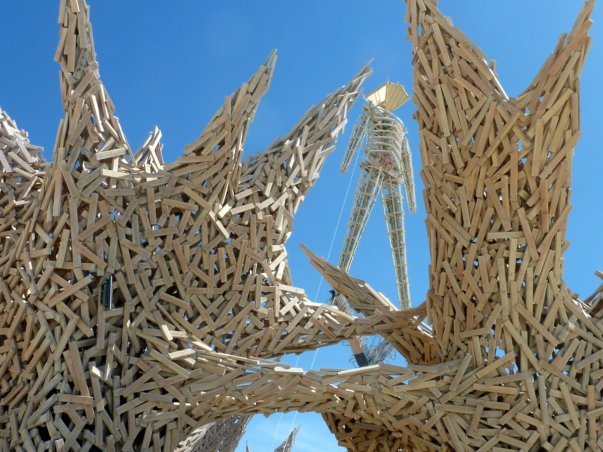 В постаменте Мэна всегда устраивают что-нибудь интересненькое. Наприемр в на фото выше, в 2013, была многоэтажная летающая тарелка с разными инсталляциями внутри. А в 2009 под Мэном стояло вот такое странное строение из нагромождённых казалось бы в случайном порядке досок.