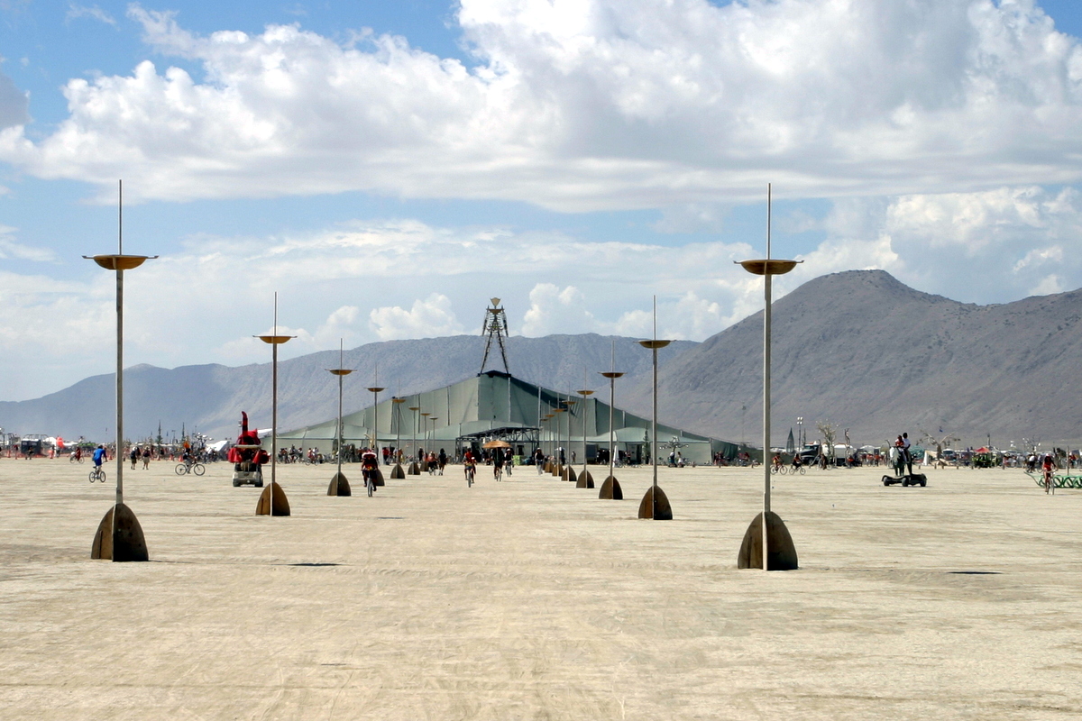 Направимся от Центр-Кэмпа вдоль шестичасового бульвара прямо к фигуре Мэна. Бульвар пересекает внутреннюю Плаю (inner playa), всего таких бульвара четыре: вдоль трёх часов, шести, девяти и двенадцати. Последний ведёт от статуи Мэна к храму, ведь там города нет. До храма мы ещё доберёмся.
