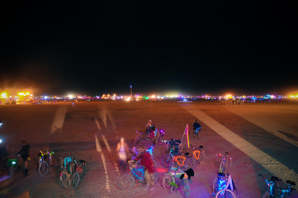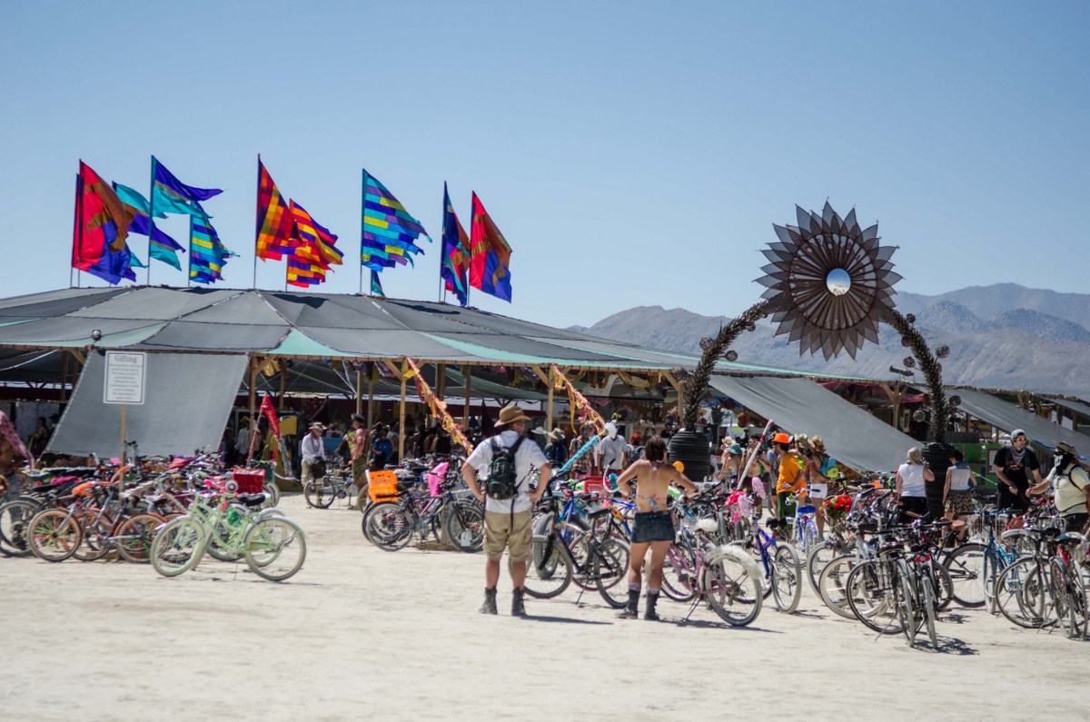 Вокруг Центер-Кэмпа припарковано куча велосипедов - важно запомнить, где оставляешь свой, чтоб потом найти. А яркие флаги, установленные на крыше видны далеко с плаи. Это второй надёжный ориентир после Мэна, его преимущество в том, что он не сгорает в конце недели.