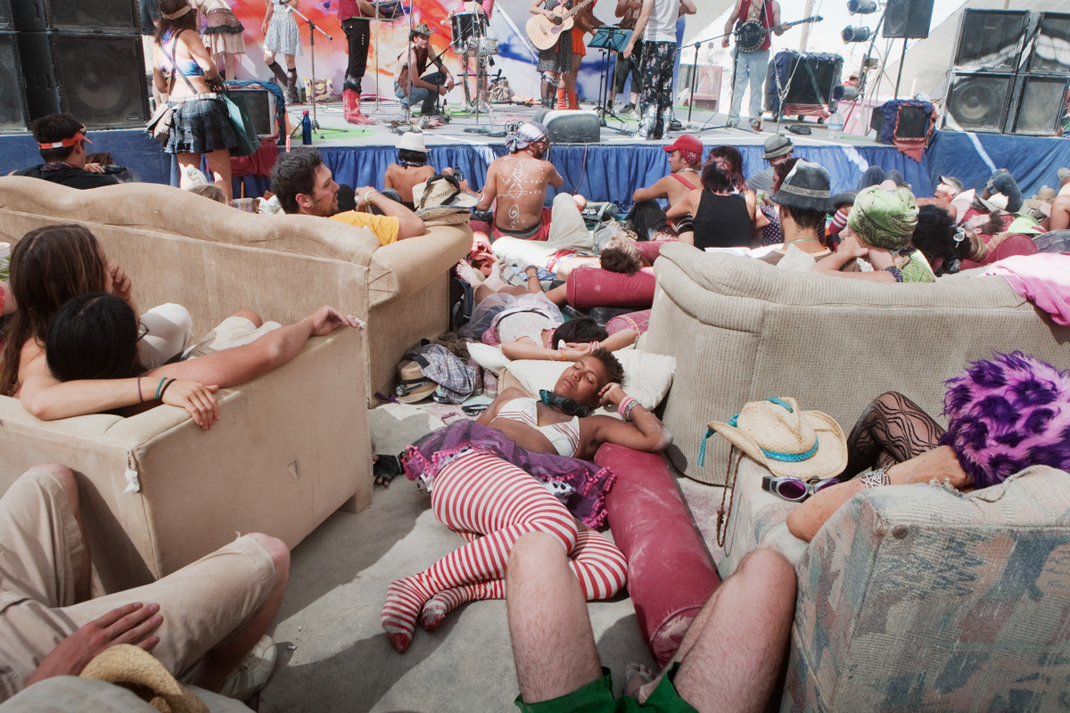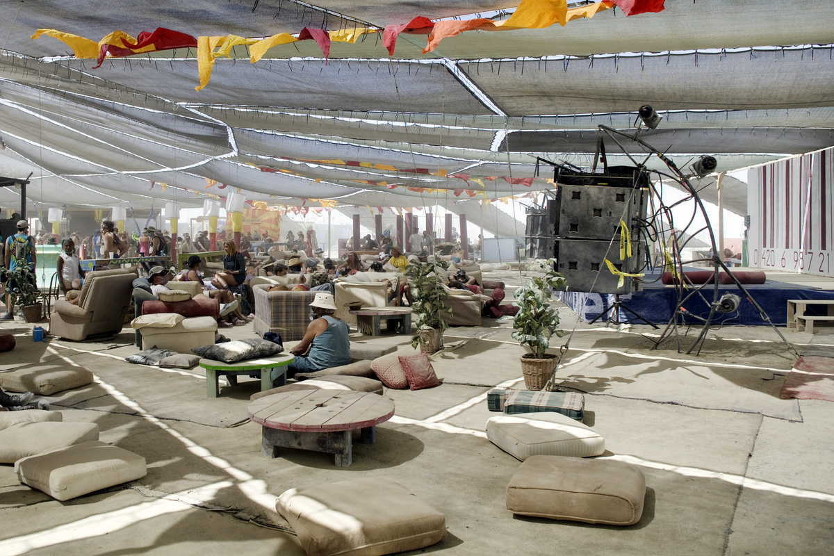 Внутри, под тенью потолка просторно и не жарко (так как структура обдувается ветром со всех сторон). Здесь можно посидеть отдохнуть от знойного дня. Более того, здесь работает единственное на всём фестивале кафе, где можно купить кофе, чай, лимонад и другие напитки. Спиртного тут нет, и просить у них просто воду тоже не сильно прилично.
