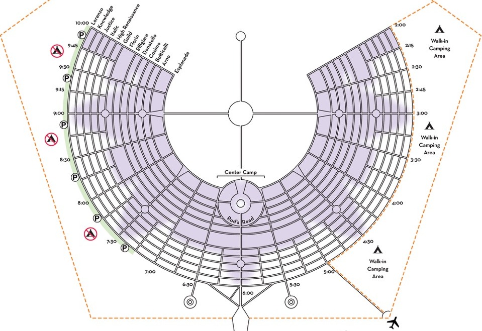 Видно, что он расположен в форме неполного круга. Его улицы - концентрические круги авеню, и радиалные лучи стритов. Стриты названы в честь часов циферблата, от 2:00 до 10:00. Авеню каждый год названы в соответствии с тематикой фестиваля, но эти названия всё время идут в алфавитном прядке. Если лень запоминать, можно называть их просто A, B, C и т.д. Самая главная авеню, которая идёт вдоль внутренней кромки города называется Эспланадом. Так что адреса в городе звучат примерно так: "3:15 и C", "7:45 и B", "8:30 и Эспланад". (Кстати на всех этих местах наш лагерь стоял в прошлом.)