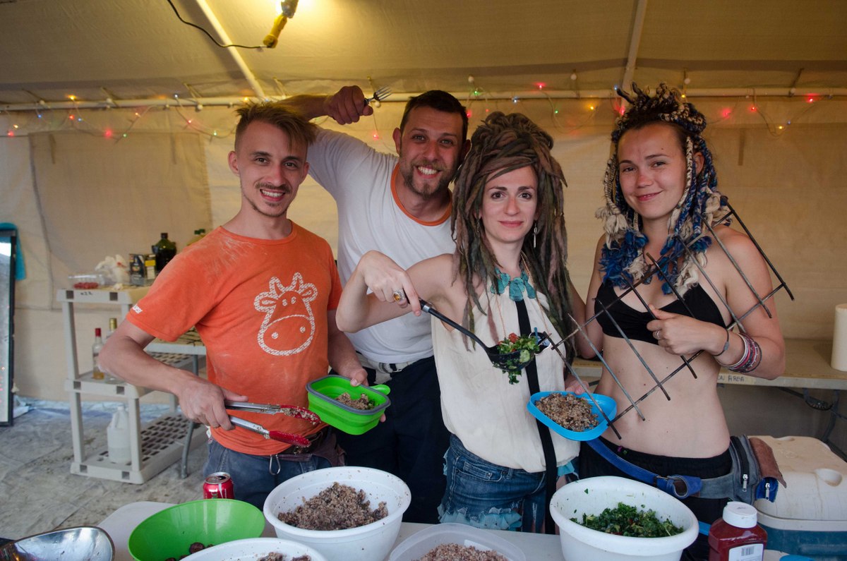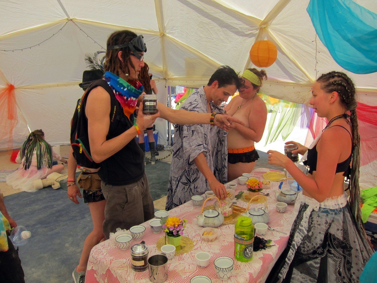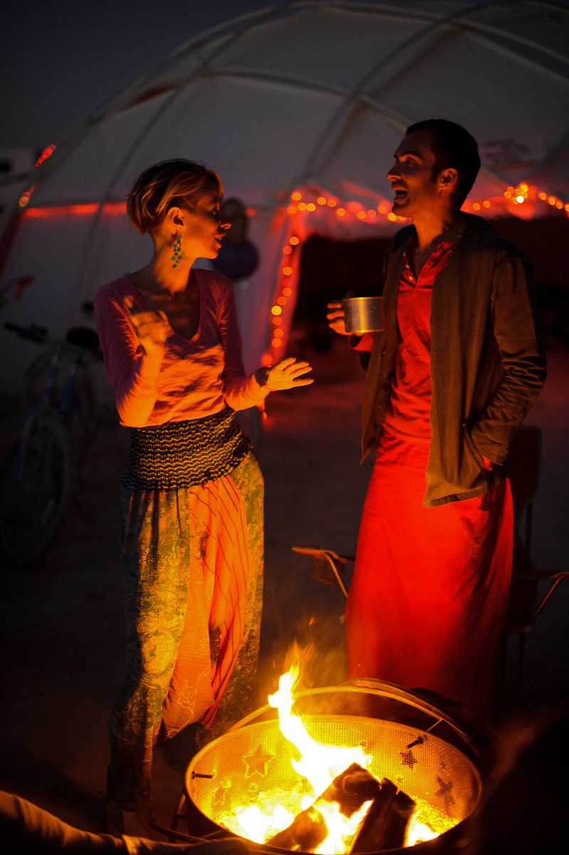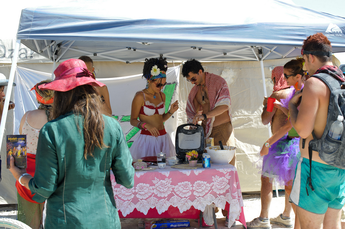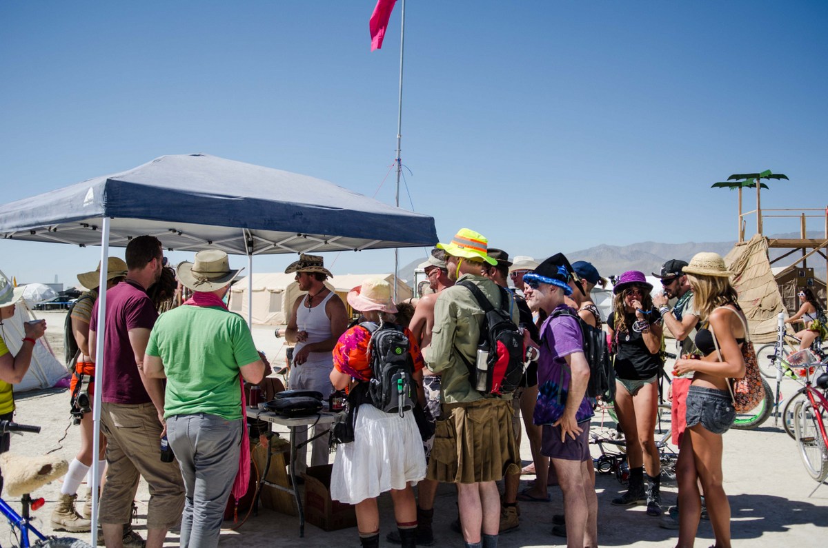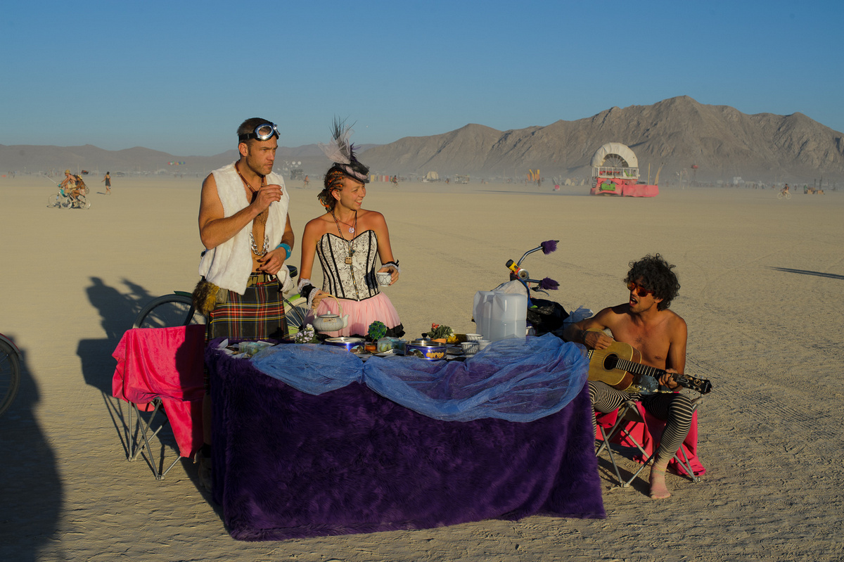 Люди с радостью останавливаются попить и пообщаться. Кто-то в знак благодарности играет на гитаре - в этом и есть вся суть Бёрнинг Мэна.