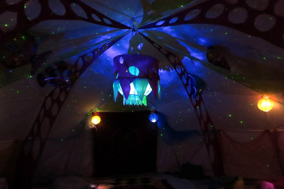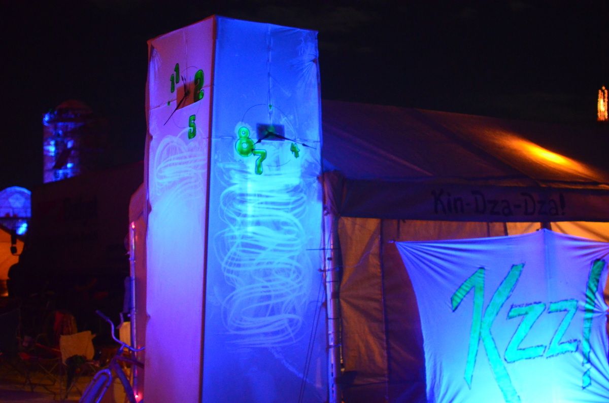 А вот часовня фестивального времени - она "высилась" метра на три с гаком, подсвечивалась изнутри, и показывала время с двух разных сторон. (Зачастую это было разное время!) К ней была пристроена "кукушка" - я насобирал пару дюжин различных коротеньких MP3 файлов с объявлениями времени, которое играло на наших колонках от моего телефона (пришлось специально написать приложение для Андроида!)