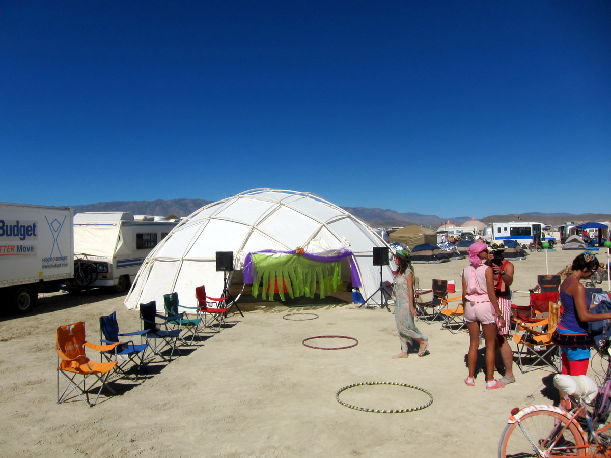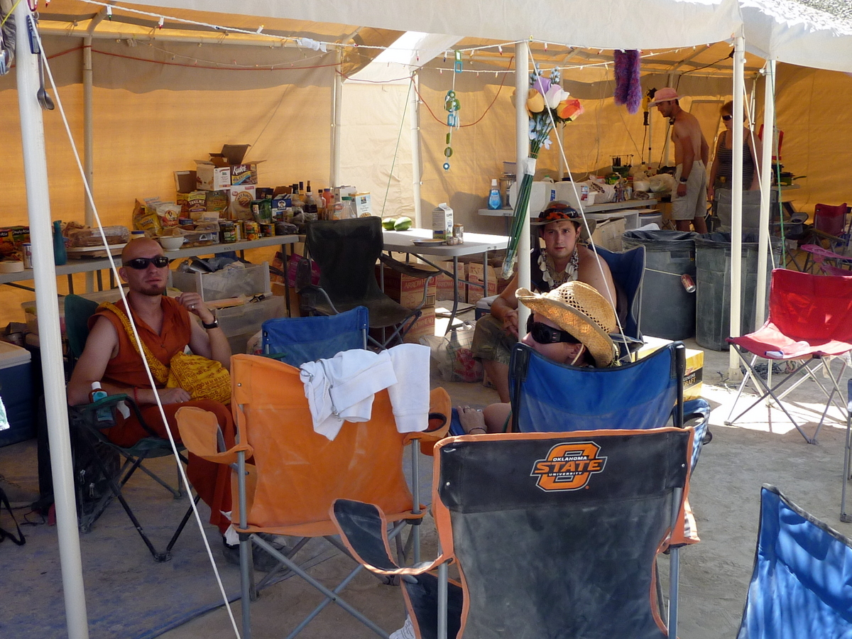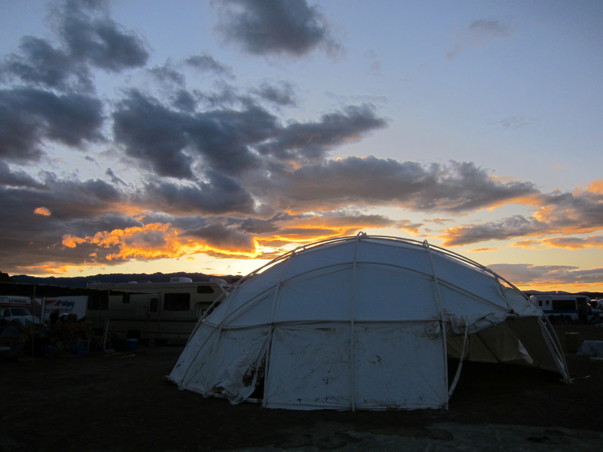 Но вообще наш лагерь довольно таки зауряден. Некоторые, кто не умеет переносить дискомфорт и походные условия, ездят на Бёрнинг Мэн в домах на колёсах - RV. Мы не из тех, предпочитаем жить в палатках и шатрах. Вот те два навеса, которые мы установили первым делом, распологаем мы их буквой "Г", спиной к ветру, чтоб пыль не задувала.