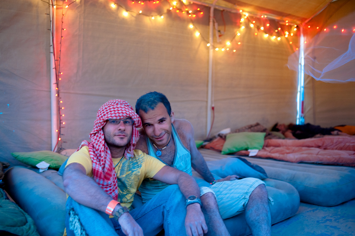 В одном из них находится "общий зал" - здесь разложены матрасы, можно поваляться, и вздремнуть днём, когда индивидуальны палатки давно превратились в душегубки под жарким солнцем.