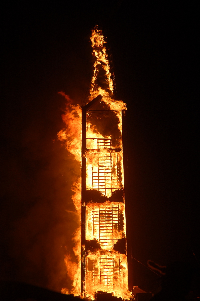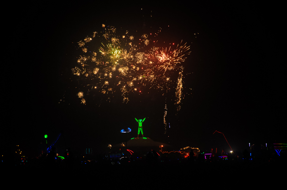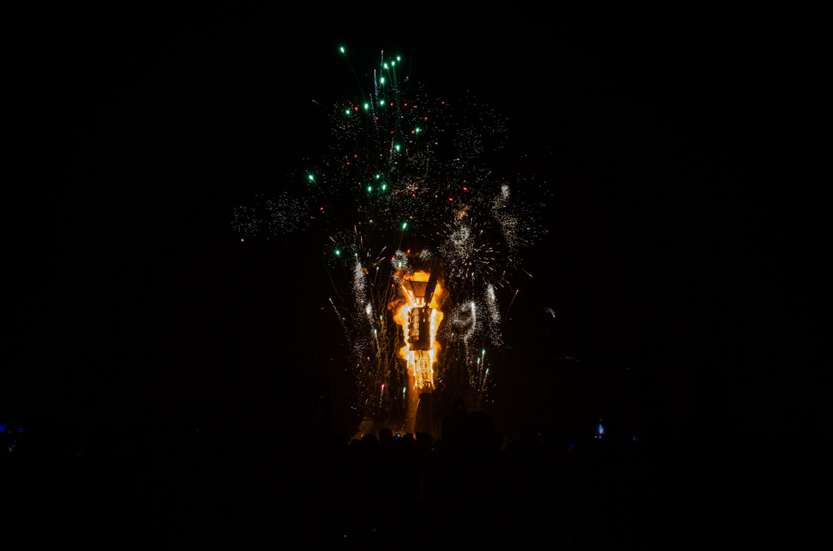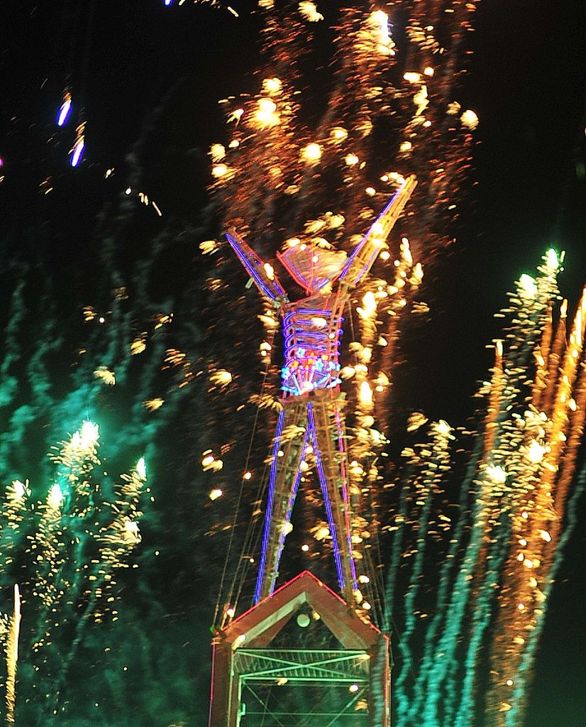 Под свист и крики толпы, под музыку сотни арт-каров фигура, которая всю неделю возвышалась над фестивалем охватывается огнём.