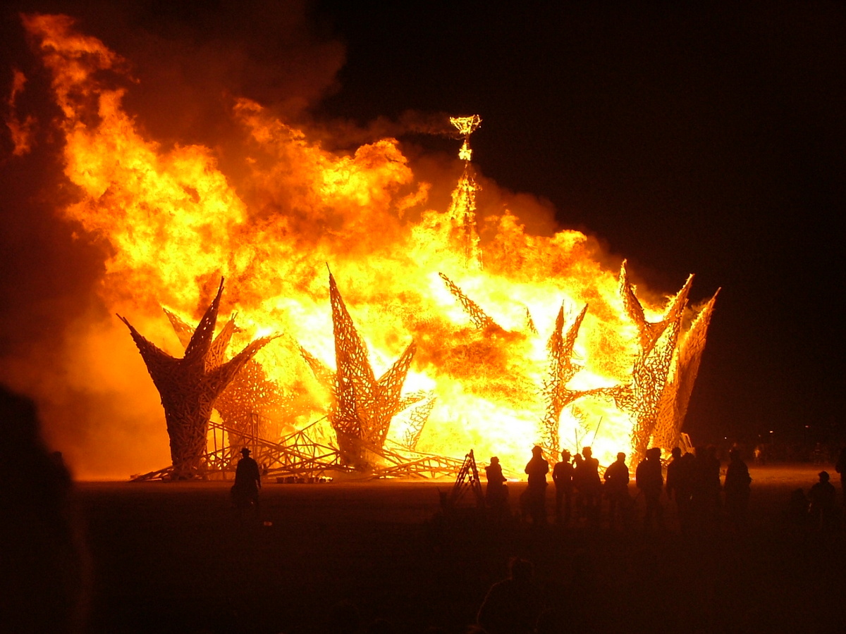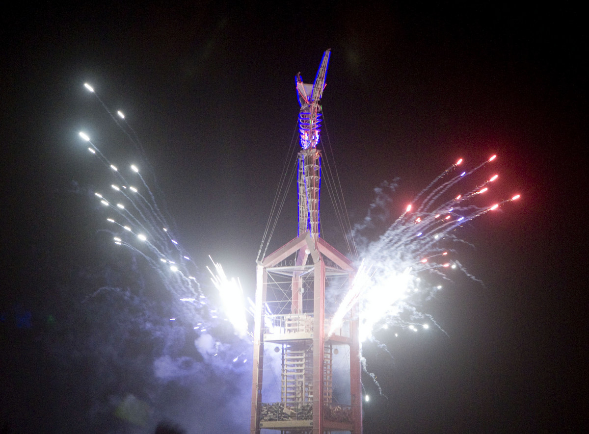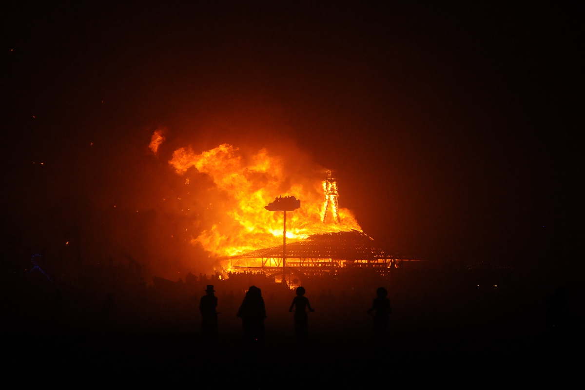 Под свист и крики толпы, под музыку сотни арт-каров фигура, которая всю неделю возвышалась над фестивалем охватывается огнём.