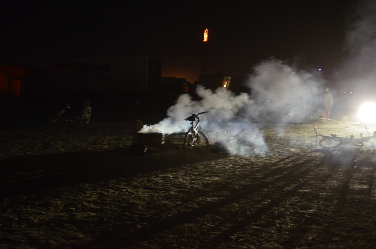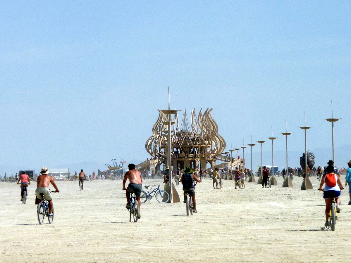 К вечеру вокруг нашего грузовика остались только велосипеды. Съездим посмотреть, как сжигают Храм, потом назад, и можно грузить велики и покидать фестиваль. Многие лагеря собираются ещё раньше - к вечеру воскресенья не так легко понять, где были улицы, так как целые кварталы Блэкрок Сити пустуют.